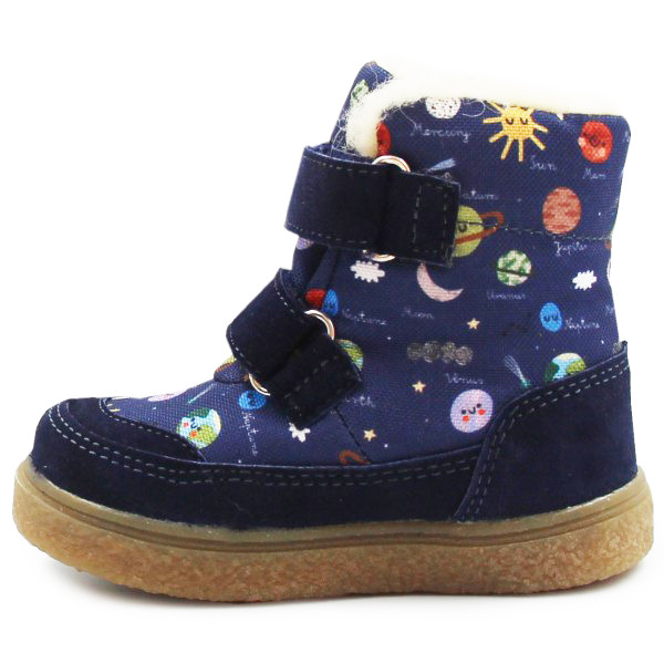 Ciepłe i wodoodporne buciki zimowe dla dzieci, wykonane z połączenia miękkiej skóry welurowej i wytrzymałego materiału tekstylnego. Wnętrze wyłożone ciepłą wełną oraz dodatkowo zabezpieczone membraną, która chroni przed wilgocią. Elastyczna podeszwa i usztywniona pięta dbają o komfort podczas użytkowania. Zapinane za pomocą dwóch praktycznych rzepów.