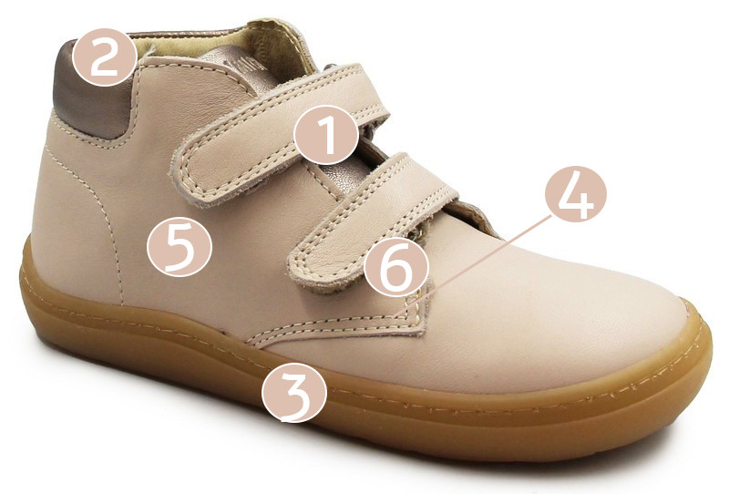 Dziecięce buty na wiosnę z elastyczną podeszwą, która zapewnia swobodę ruchu stopy. Jest szersza w okolicy palców, dzięki czemu palce mogą swobodnie się poruszać. Zapinane za pomocą dwóch praktycznych rzepów.