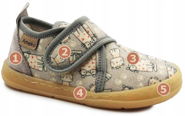 Elastyczne kapcie dziecięce wykonane z naturalnej bawełny, pianki ze skórzanym wnętrzem. Posiadają lekko usztywniony zapiętek, który ma za zadanie stabilizować piętę podczas chodzenia. Podeszwa jest bardzo elastyczna i nie ogranicza ruchomości stopy podczas zabaw.