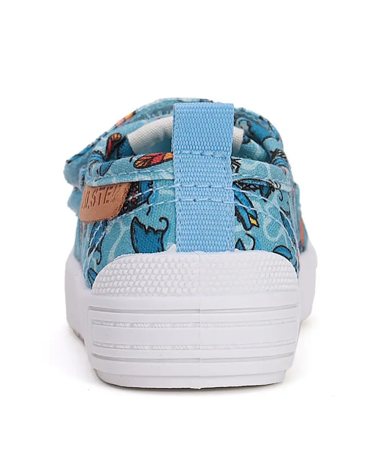 Dziecięce buty tekstylne z motywem rekinów w kolorystyce niebieskiej. To obuwie zarówno na dwór jak i jako obuwie zmienne do szkoły czy przedszkola. Regulowane za pomocą dwóch rzepów, które są szybkie, łatwe oraz praktyczne w użyciu. Wyposażone w powłokę hydrofobową, która odciągać wilgoć. Dla zwiększenia wodoodporności zaleca się przed stosowaniem użycie impregnatu.
