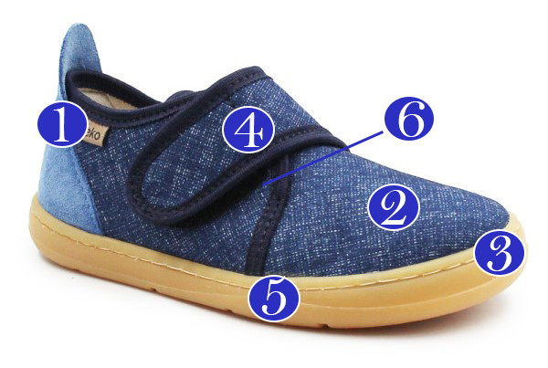 Elastyczne kapcie dziecięce wykonane z naturalnej bawełny, pianki ze skórzanym wnętrzem. Posiadają lekko usztywniony zapiętek, który ma za zadanie stabilizować piętę podczas chodzenia. Podeszwa jest bardzo elastyczna i nie ogranicza ruchomości stopy podczas zabaw.