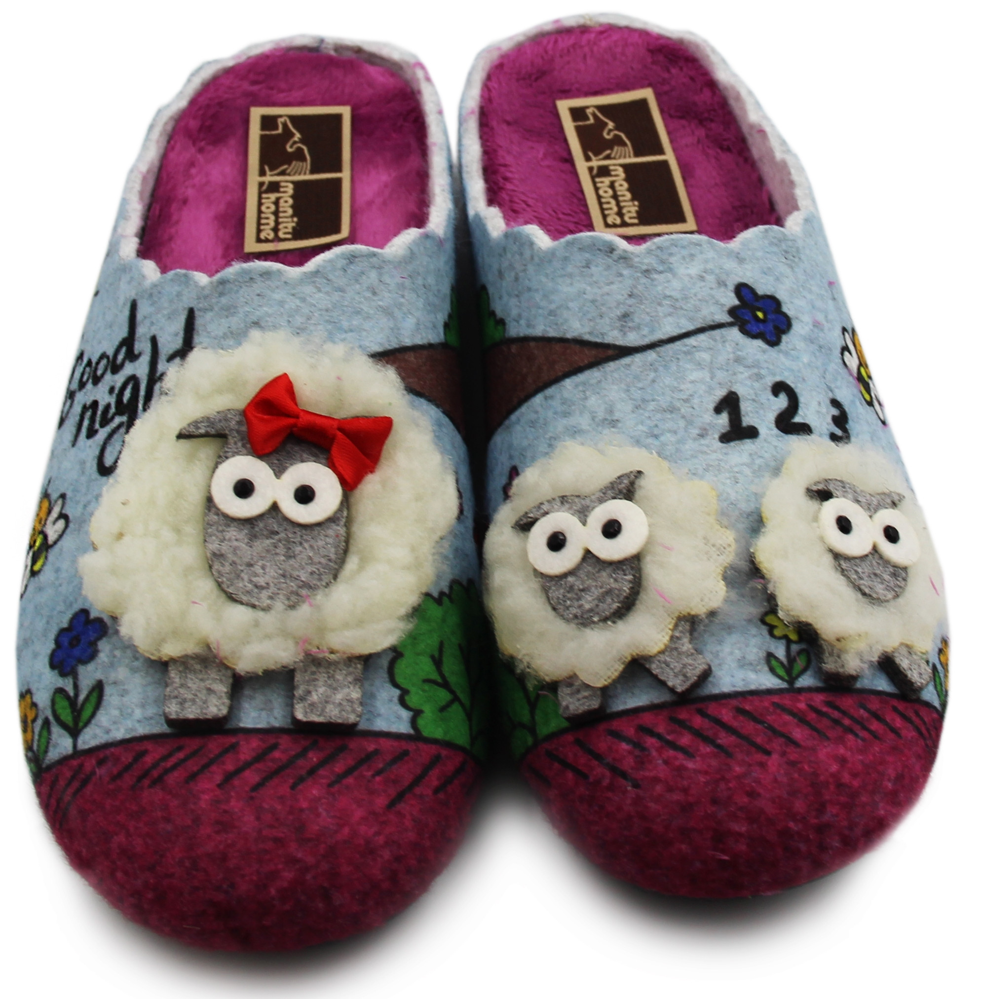 ✅ Kapcie Domowe Damskie MANITU-HOME z uroczym motywem owieczek w kolorach błękitny, bordowy, szary, wykonane zostały z miękkiego i ciepłego filcu.