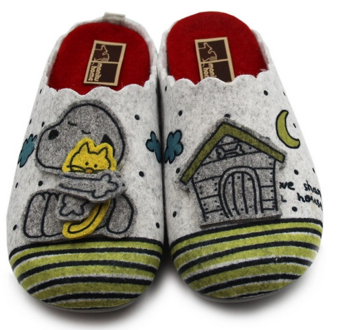 ✅ Kapcie Domowe Damskie MANITU-HOME z uroczym motywem pieska i kotka w kolorze szarym i czerwonym, wykonane zostały z miękkiego i ciepłego filcu.
