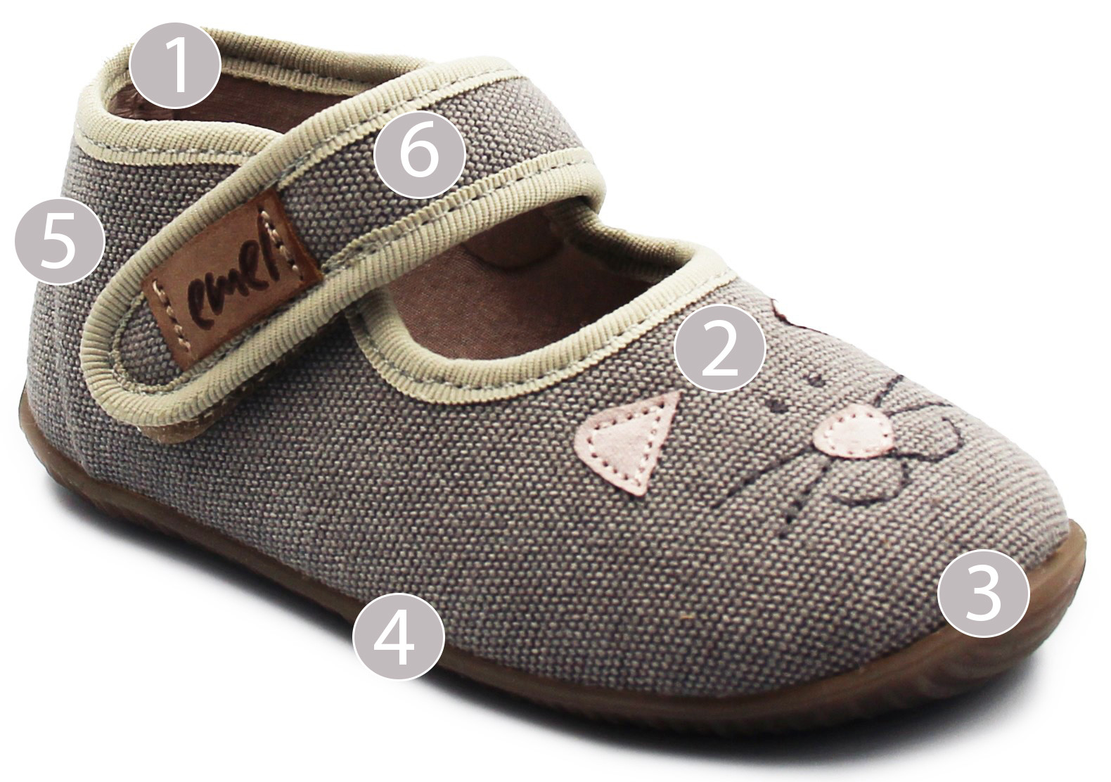 6. Zapięcie na rzep, umożliwia dopasowanie kapci do stopy dziecka.