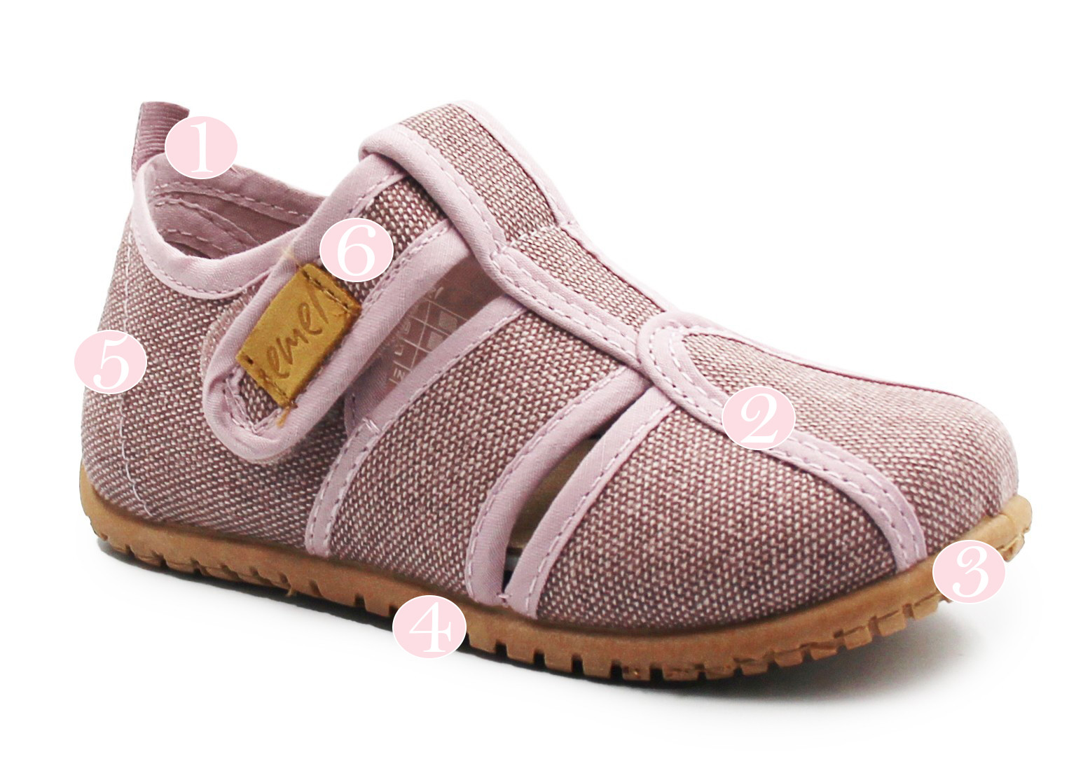 6. Zapięcie na rzep, umożliwia dopasowanie kapci do stopy dziecka.