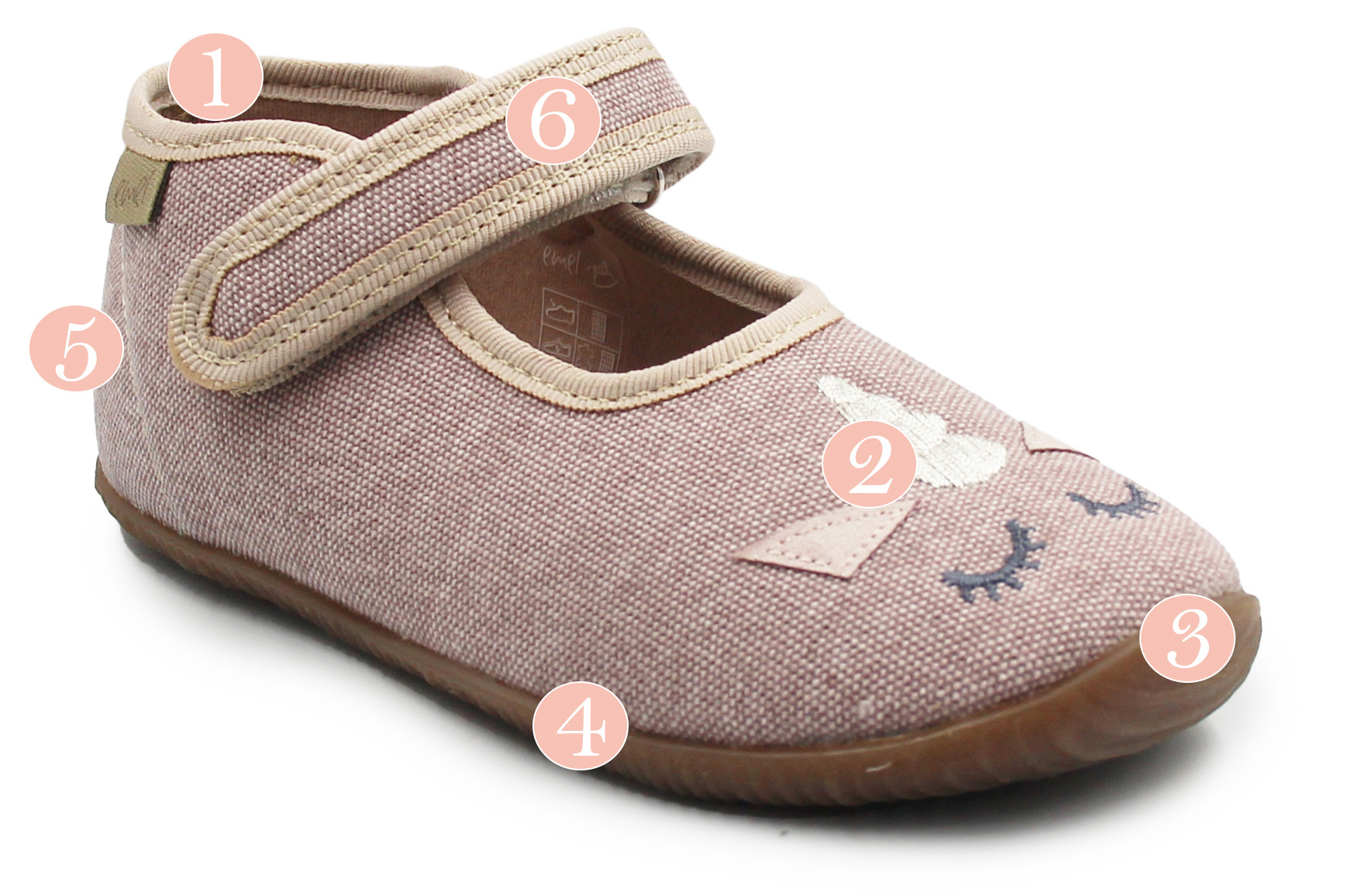 6. Zapięcie na rzep, umożliwia dopasowanie kapci do stopy dziecka.