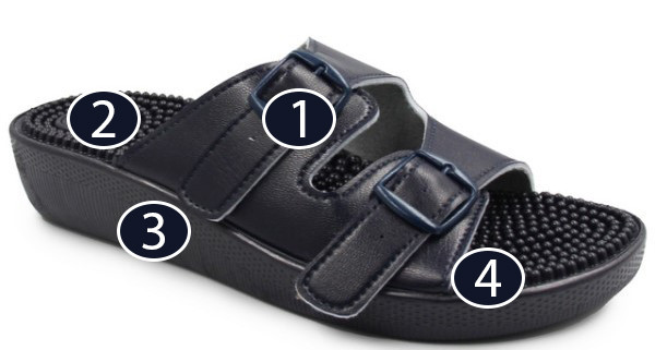 Klapki wyposażone są w kolce, które stymulują punkty akupresury w stopach.