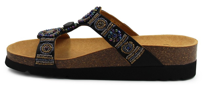 Model New Bogota to kultowy model marki Scholl, dzięki ręcznie plecionym koralikom. Miękka podwójna cholewka otula stopę i zapewnia komfort noszenia. Podeszwa została z naturalnego korka oraz gumy. Podczas produkcji zastosowano technologię BIOPRINT. Sprawdzą się podczas wakacji, jako klapki na co dzień oraz do pracy.