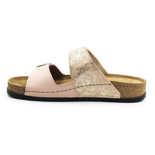 Damskie klapki na lato z miękką wkładką, która daje komfort nawet podczas długiego noszenia obuwia. Błyszczący pozłacany pasek dodaje klapkom elegancki wygląd. Wyposażone w regulowane sprzączki na obydwóch paskach, co pozwala na dokładniejsze dopasowanie do szerokości stopy. Lekka elastyczna podeszwa przypominająca korek oferuje wysoki komfort oraz styl. Klapki sprawdzą się jako obuwie domowe, klapki wakacyjne, obuwie do pracy. Pamiętaj by nie były poddawane warunkom ciężkim jak np. pyły, zbyt wysokie temperatury, wilgoć.