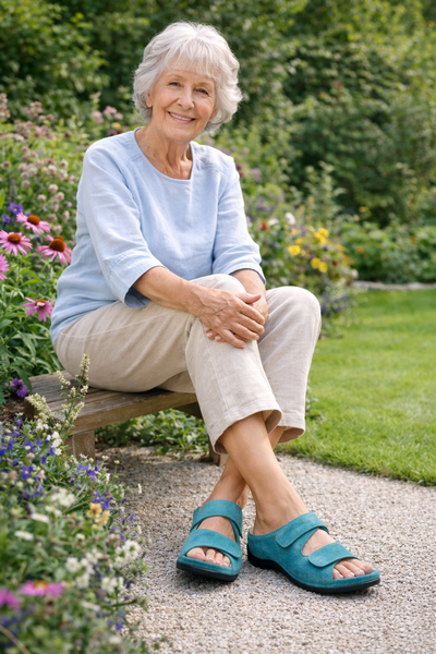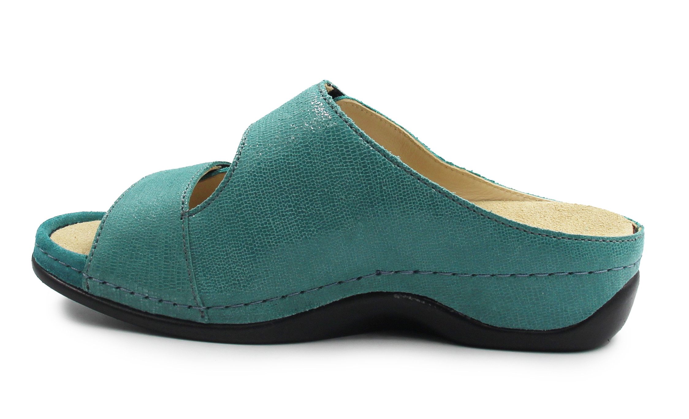 Klapki Berkemann Daria zostały wykonane z wysokiej jakości skóry naturalnej w turkusowym kolorze. Dwa szerokie paski zapinane na rzep pozwalają precyzyjnie dopasować obuwie do kształtu stopy, co zwiększa komfort noszenia przez cały dzień - zarówno w pracy, jak i podczas spacerów czy domowego użytkowania.