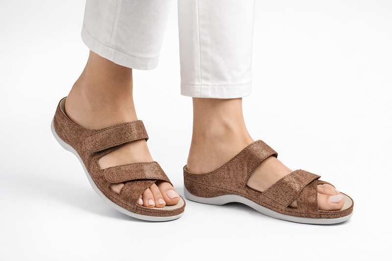 Dzięki dwóm regulowanym zapięciom na rzep - nad podbiciem oraz w przedniej części stopy - klapki Felia doskonale dopasowują się do indywidualnego kształtu stopy. To szczególnie ważne dla osób poszukujących klapek na szeroką stopę, butów o większej tęgości lub wygodnych laczków z regulacją.