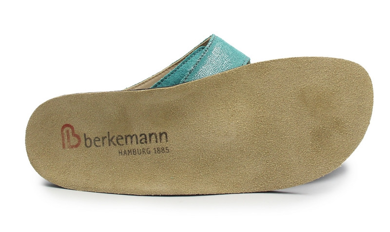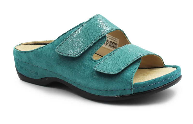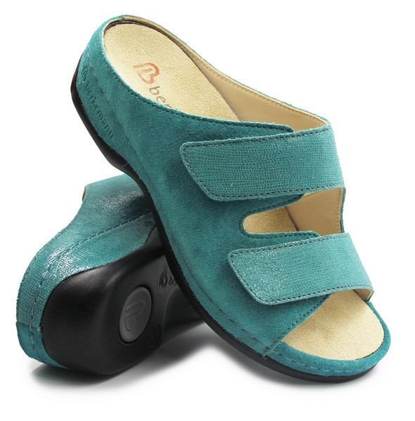 Klapki Berkemann Daria zostały wykonane z wysokiej jakości skóry naturalnej w turkusowym kolorze. Dwa szerokie paski zapinane na rzep pozwalają precyzyjnie dopasować obuwie do kształtu stopy, co zwiększa komfort noszenia przez cały dzień - zarówno w pracy, jak i podczas spacerów czy domowego użytkowania.