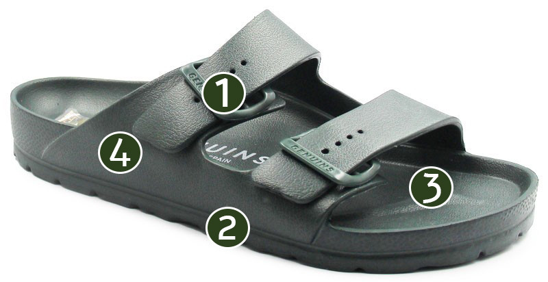 Klapki sprawdzą się na plażę, basen, do pracy oraz na co dzień. Posiadają właściwości wodoodporne. Wykonane są z materiału EVA, zapinane za pomocą dwóch klamr, które umożliwiają dokładniejsze dopasowanie do stopy. Wkładka dopasowuje się od anatomicznych kształtów stopy użytkownika.