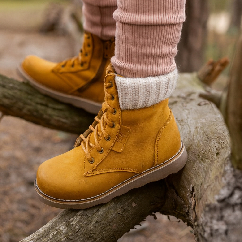 Wnętrze trzewików wyściełane jest naturalną wełną, która stanowi doskonałą izolację termiczną. Ten materiał nie tylko grzeje, ale też odprowadza nadmiar wilgoci, zapobiegając poceniu się stóp. Dzięki temu buty zapewniają idealny mikroklimat, nawet podczas długich spacerów w chłodne dni.