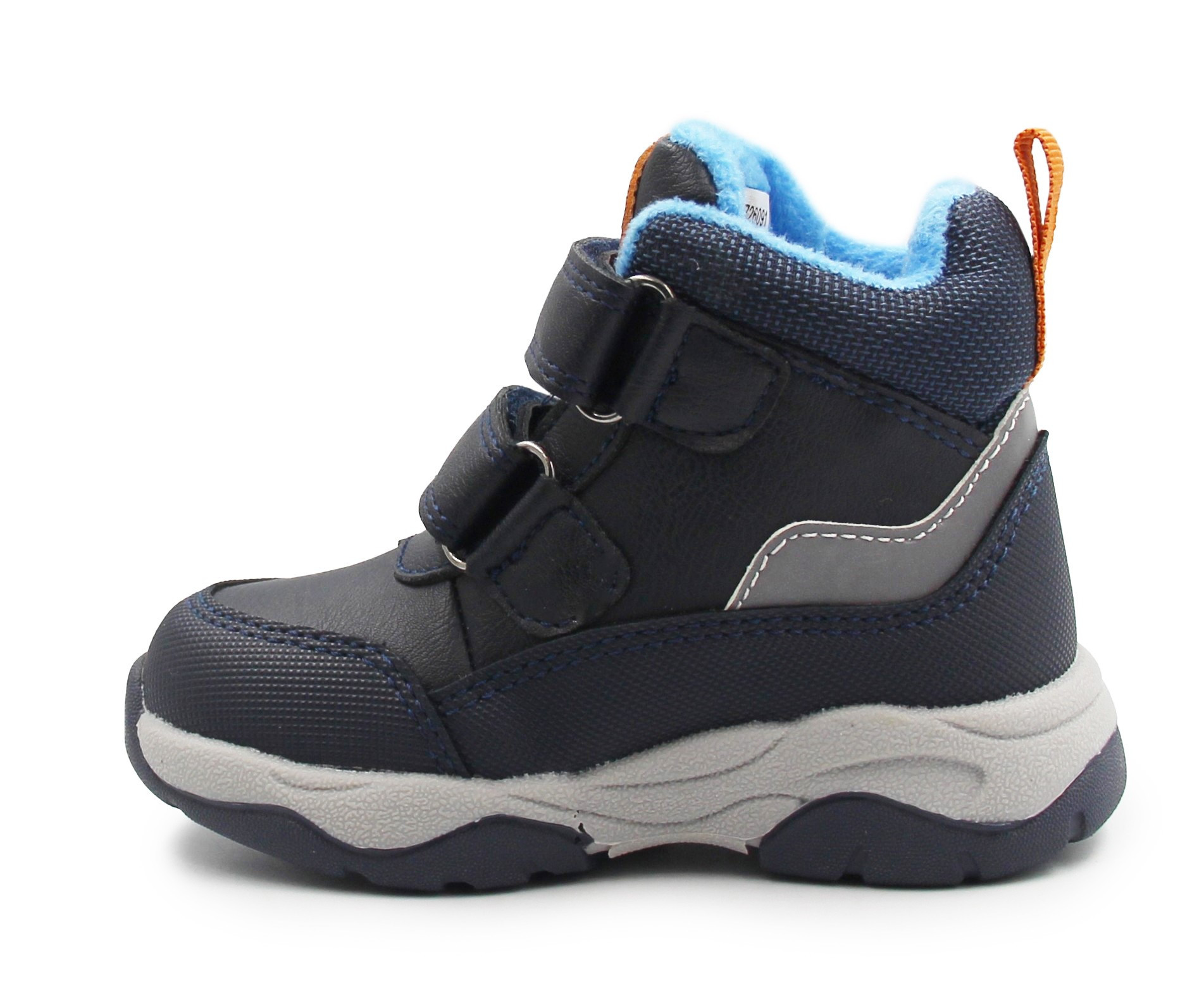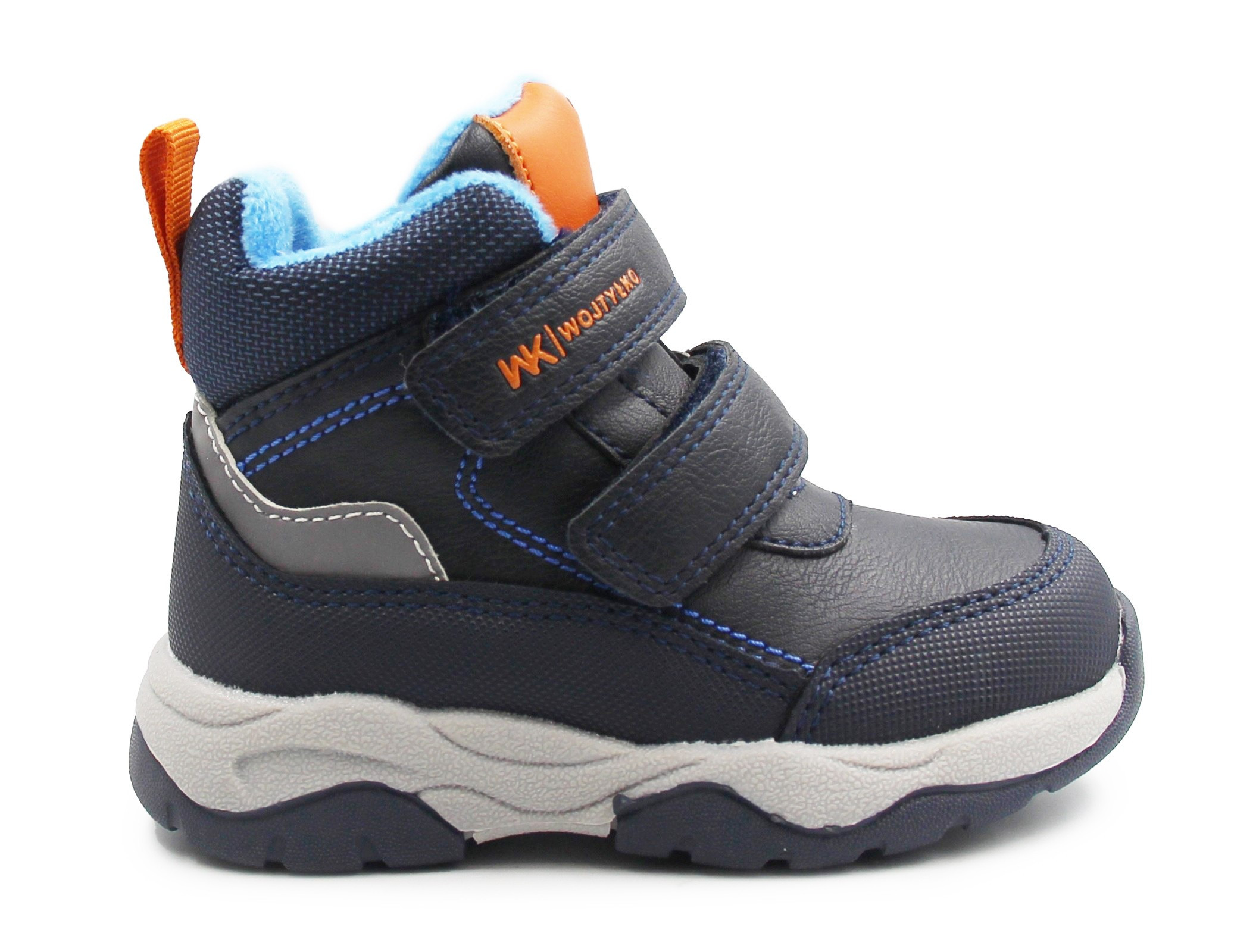 Chłopięce buty ocieplone miękkim materiałem wewnątrz, który ogrzewa stopę. Zapinane za pomocą dwóch praktycznych rzepów. Zapiętek stabilizuje stopę i utrzymuje ją w prawidłowej pozycji.