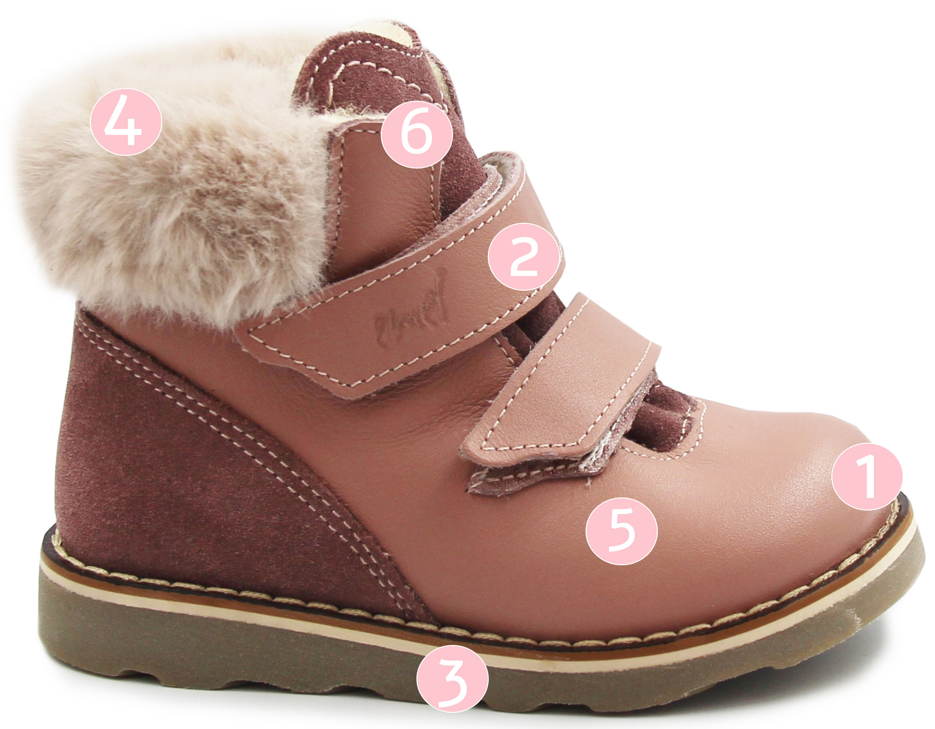 Buty zimowe dla dziewczynki ocieplone miękkim futerkiem, które dodatkowo ogrzewa stopę dziecka. Wyściółka jest ocieplana z termoizolacją. Wykonane ze skóry naturalnej (wolnej od chromu). Podeszwa wykonana z termokauczuku. W butach zastosowano membranę typu Te-Por.