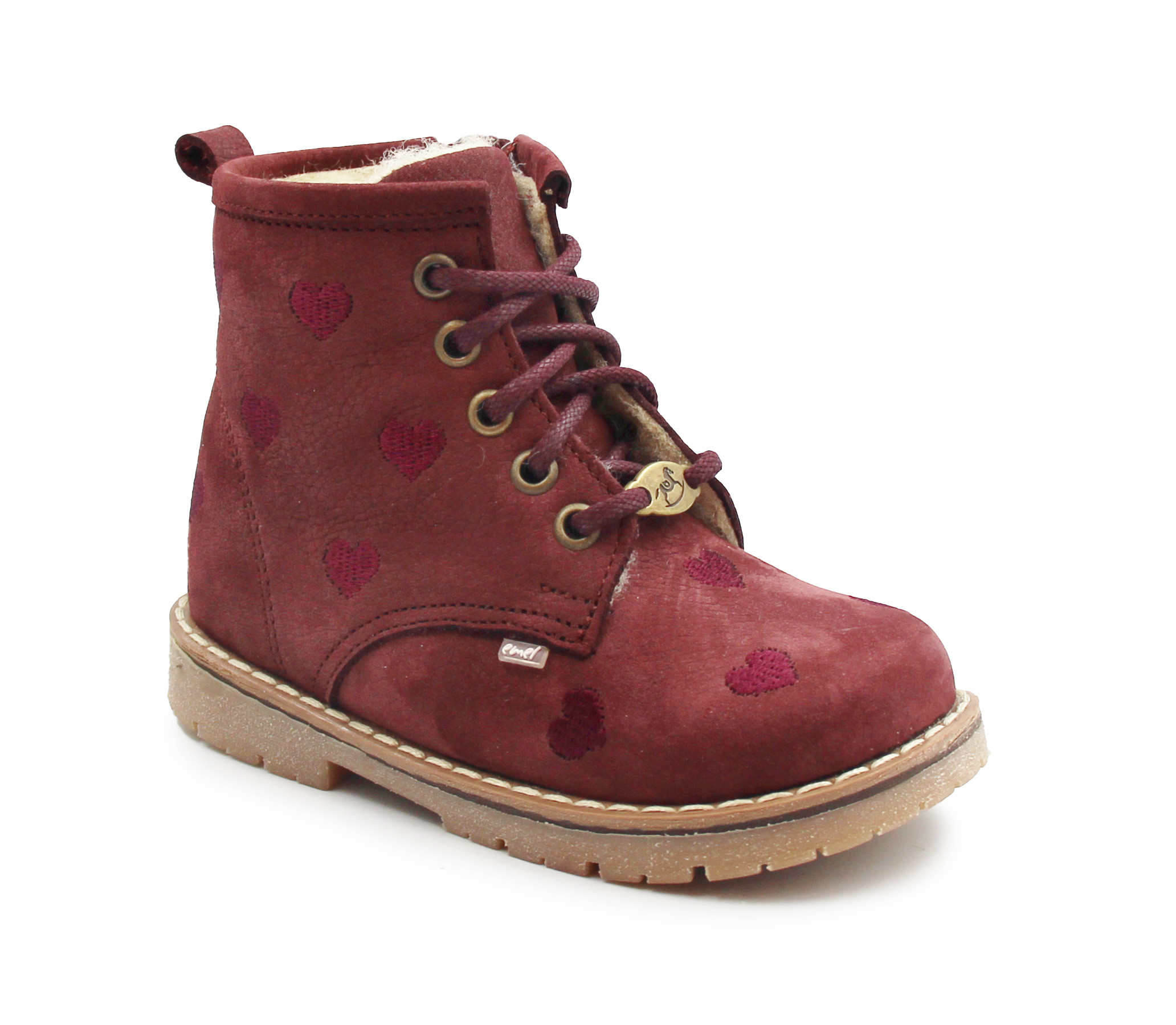 Ręcznie wykonane trzewiki Emel EV 2727F Bergen to połączenie ciepła, wygody i wyjątkowego stylu. Ten model w głębokim odcieniu bordo, ozdobiony delikatnymi serduszkami, powstał z myślą o dziewczynkach, które lubią łączyć komfort z uroczym wyglądem. Buty są w całości wykonane ze skóry naturalnej, dzięki czemu doskonale dopasowują się do stopy i zapewniają trwałość przez wiele sezonów.