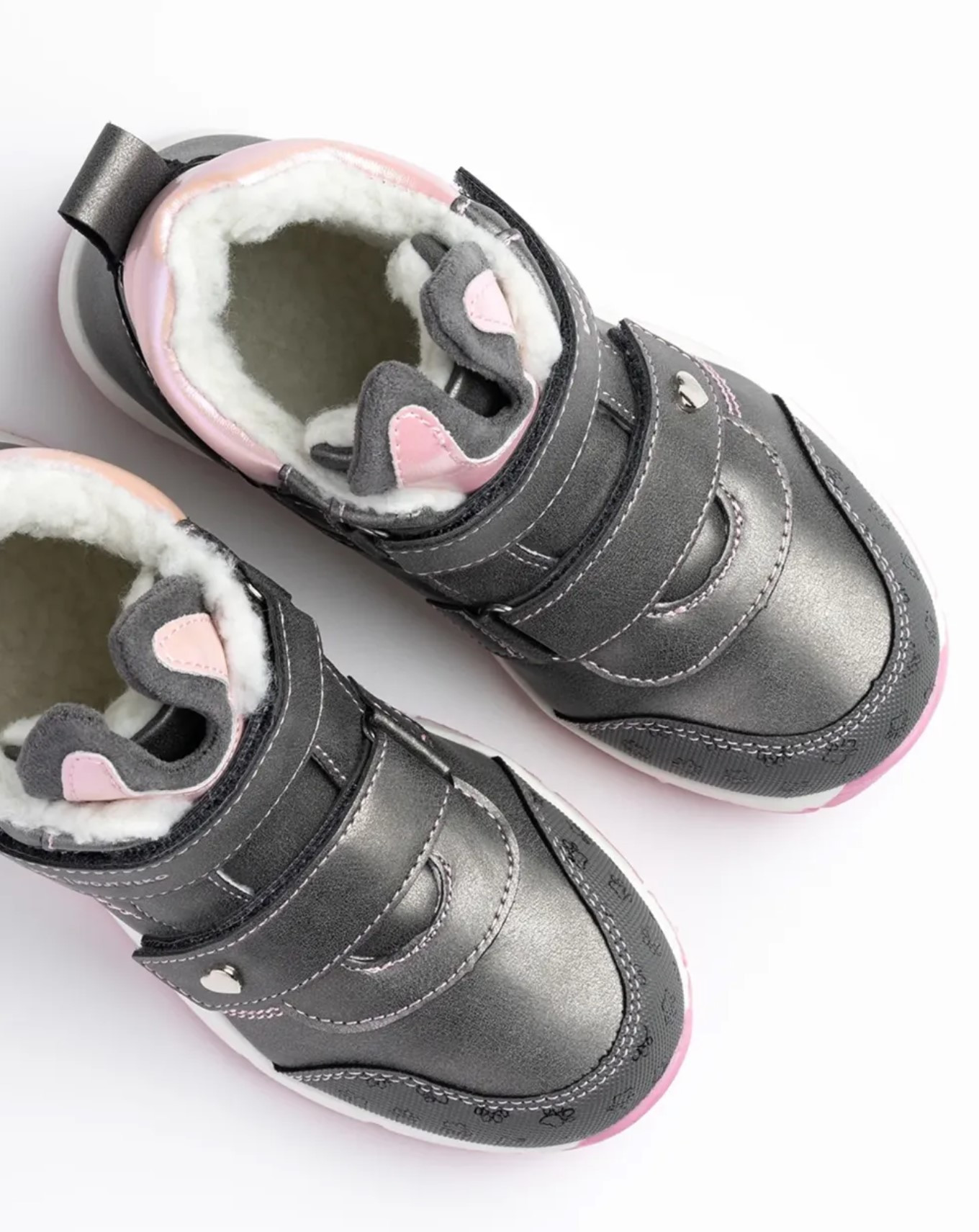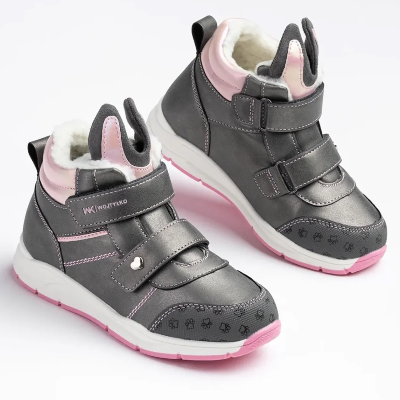 Dziewczęce buty na zimę wypełnione wewnątrz miękkim materiałem ocieplanym, który ogrzewa stopy podczas chłodniejszych temperatur. Zapinane za pomocą dwóch rzepów, które praktyczne, szybkie oraz łatwe w użyciu. Na butach znajdują się dwa uszka, które dodają im uroku.