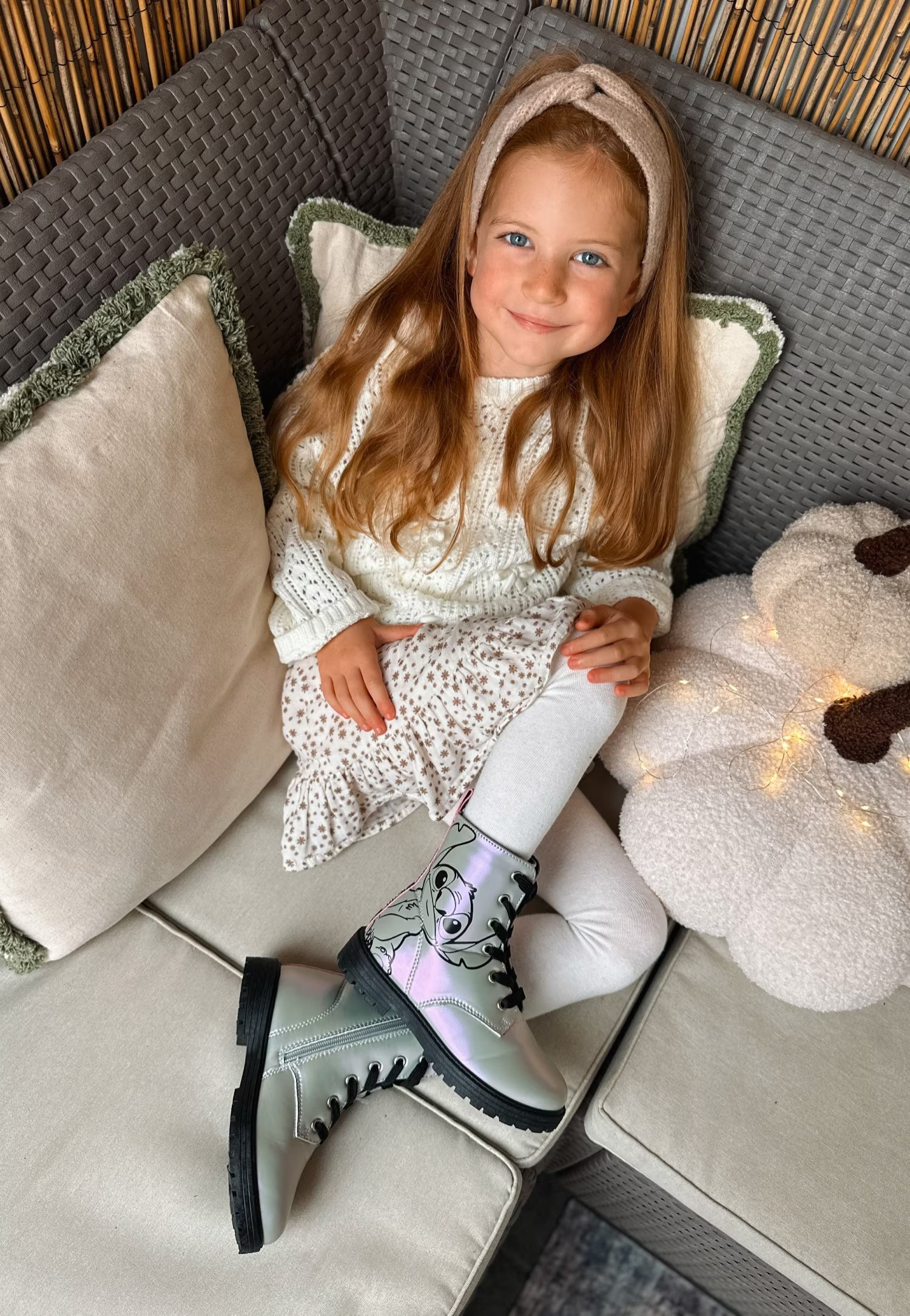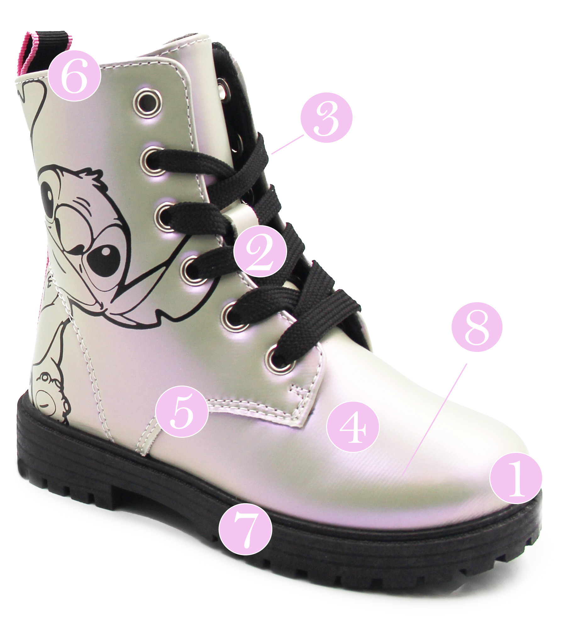 Efekt WOW! Materiał wierzchni z efektem holograficzny. Buty mienią się przy każdym ruchu, dodając magii codziennym stylizacjom. Wnętrze trzewików wyściełane jest miękkim materiałem tekstylnym, który zapewnia miękkość oraz lekkie ocieplenie. Zapinane za pomocą praktycznego suwaka oraz sznurowadeł. W zewnętrznej stronie buta znajduje się bohater znanej bajki Lilo i Stitch.