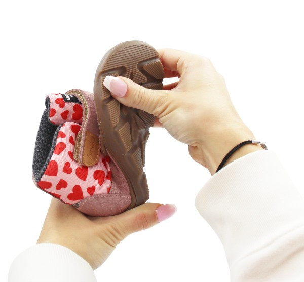 Buty dla dziewczynki na sezon jesienny oraz początek zimy. Posiadają Membranę, której zadaniem jest utrzymanie stóp dziecka w suchości. Wnętrze otula stopę miękkim materiałem sweterkowym. Zapinane za pomocą praktycznych rzepów. Podeszwa jest elastyczna i daje uczucie "bosej stopy", nie ogranicza ruchomości stopy i pozwala swobodnie się poruszać.
