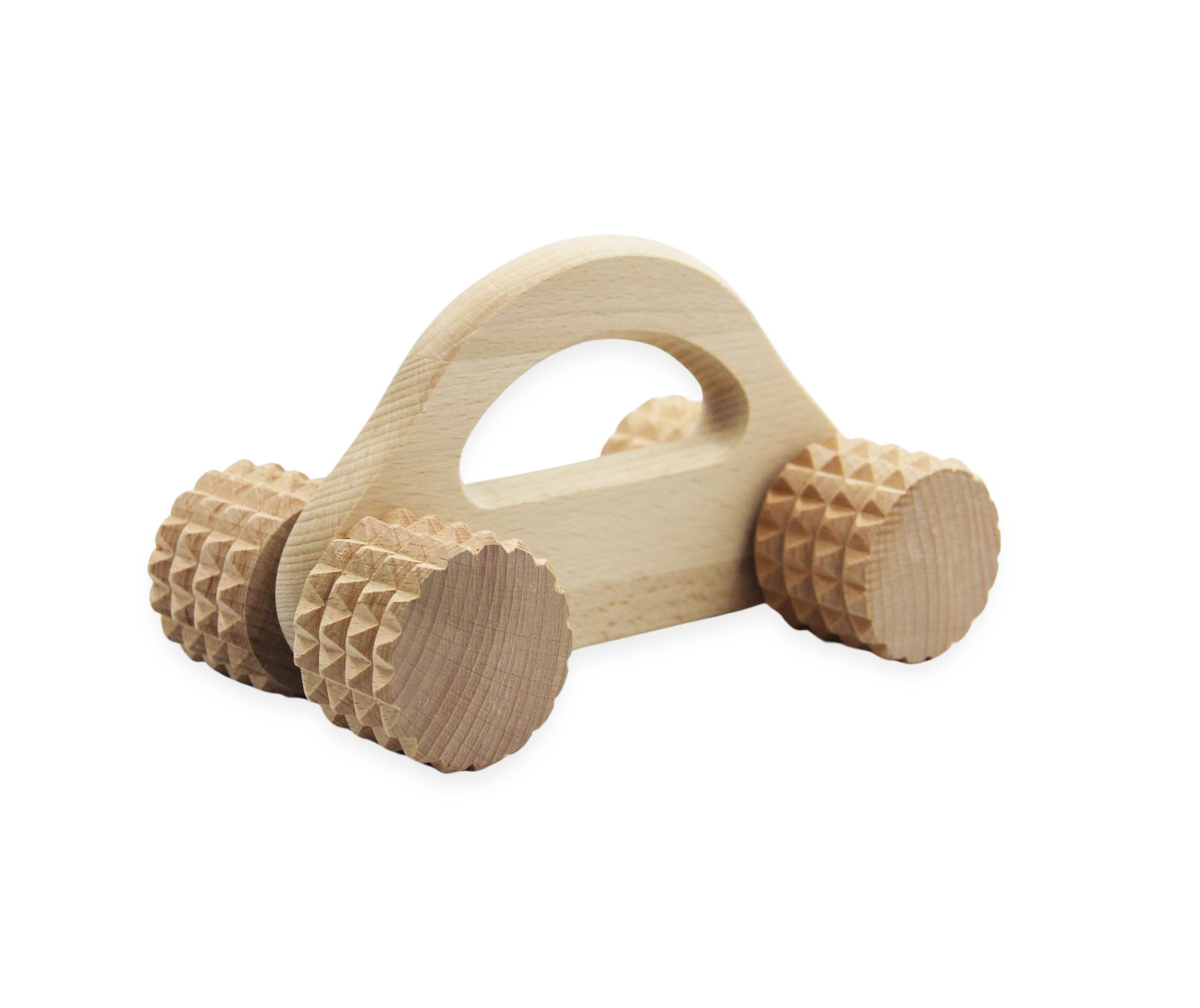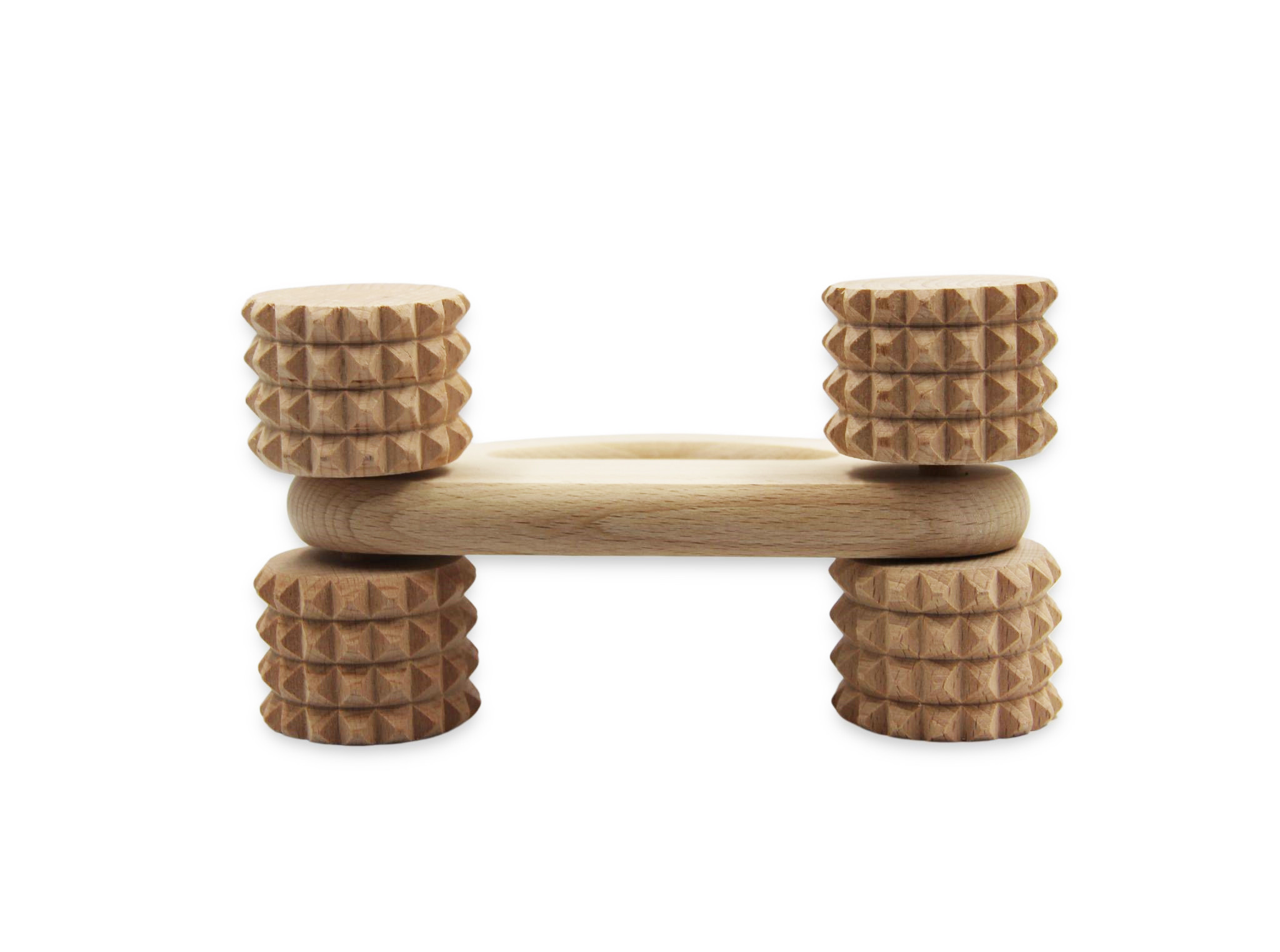 Posiada 4 wałki masujące z wypustkami, które swobodnie się poruszają nie stawiając oporu podczas użytkowania. Wyposażony w uchyt, który dodatkowo ułatwia wykonanie masażu również w sposób samodzielny.