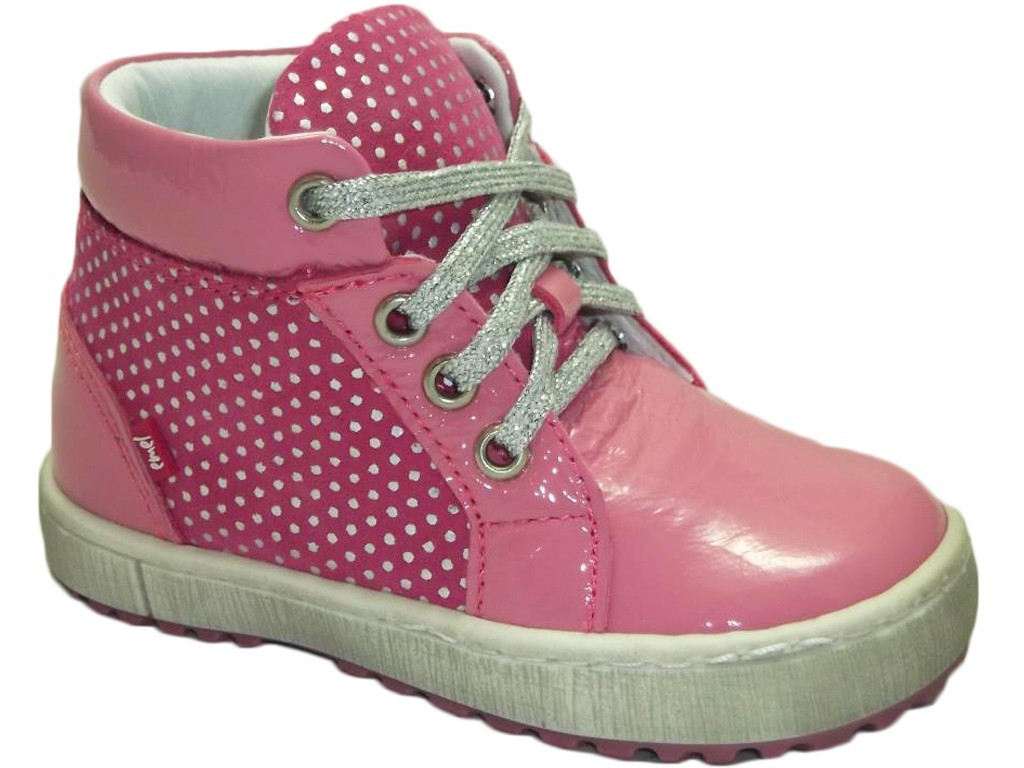 ☘️ Dziewczęce trzewiki, polskiej marki Emel w różowym kolorze, w srebrne kropki.