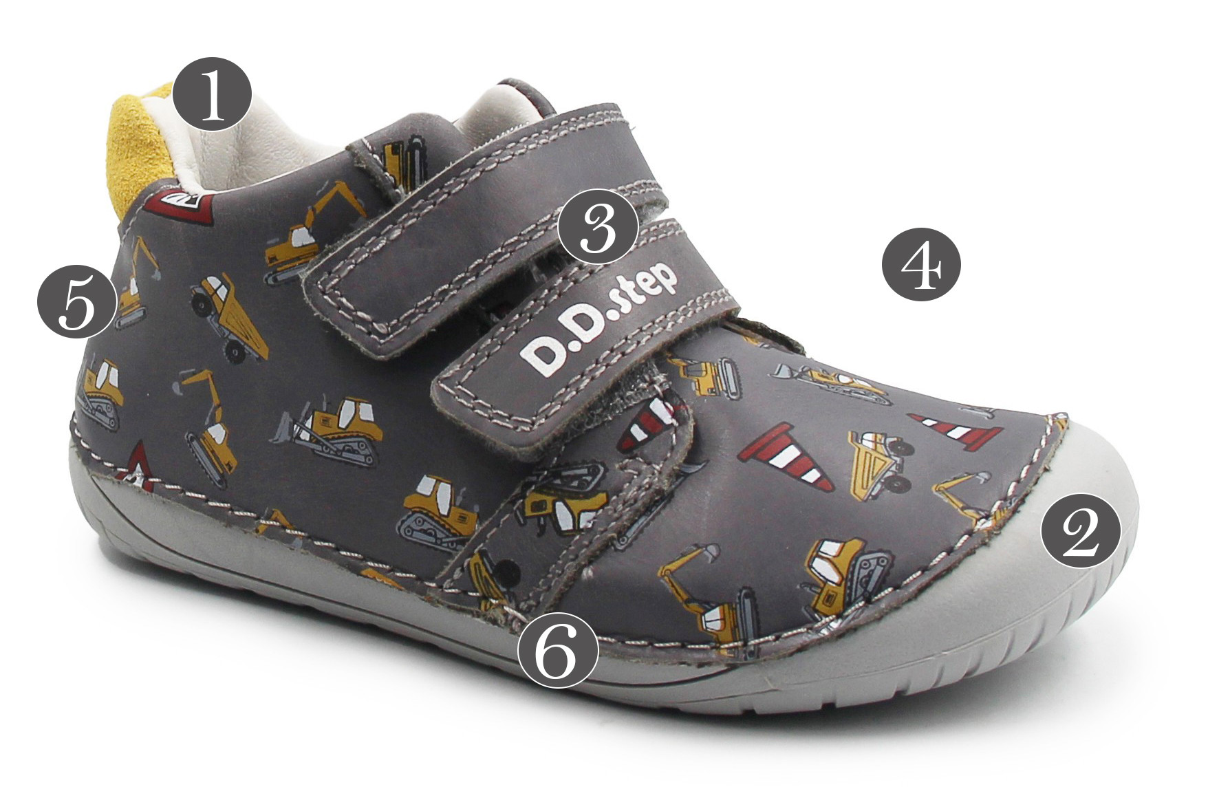 Zarówno z zewnątrz, jak i w środku, wykonane są z miękkiej skóry, co zapewnia komfort i odpowiednią wentylację dla stóp. Ich elastyczna, miękka podeszwa zapewnia swobodę ruchów. Zapiętek delikatnie stabilizuje stopę, jednocześnie pozostawiając dużo miejsca na palce. Zapinane za pomocą dwóch rzepów, co jest praktyczne oraz szybkie, a dodatkowo umożliwia dziecku samodzielne zakładanie. Elastyczna podeszwa dopasowuje się do kształtu stopy, zapewniając maksymalne czucie powierzchni i naturalny ruch. Buty posiadają szersze czubki, co daje więcej miejsca z przodu na paluszki, przez co mogą one zachować naturalne ułożenie.