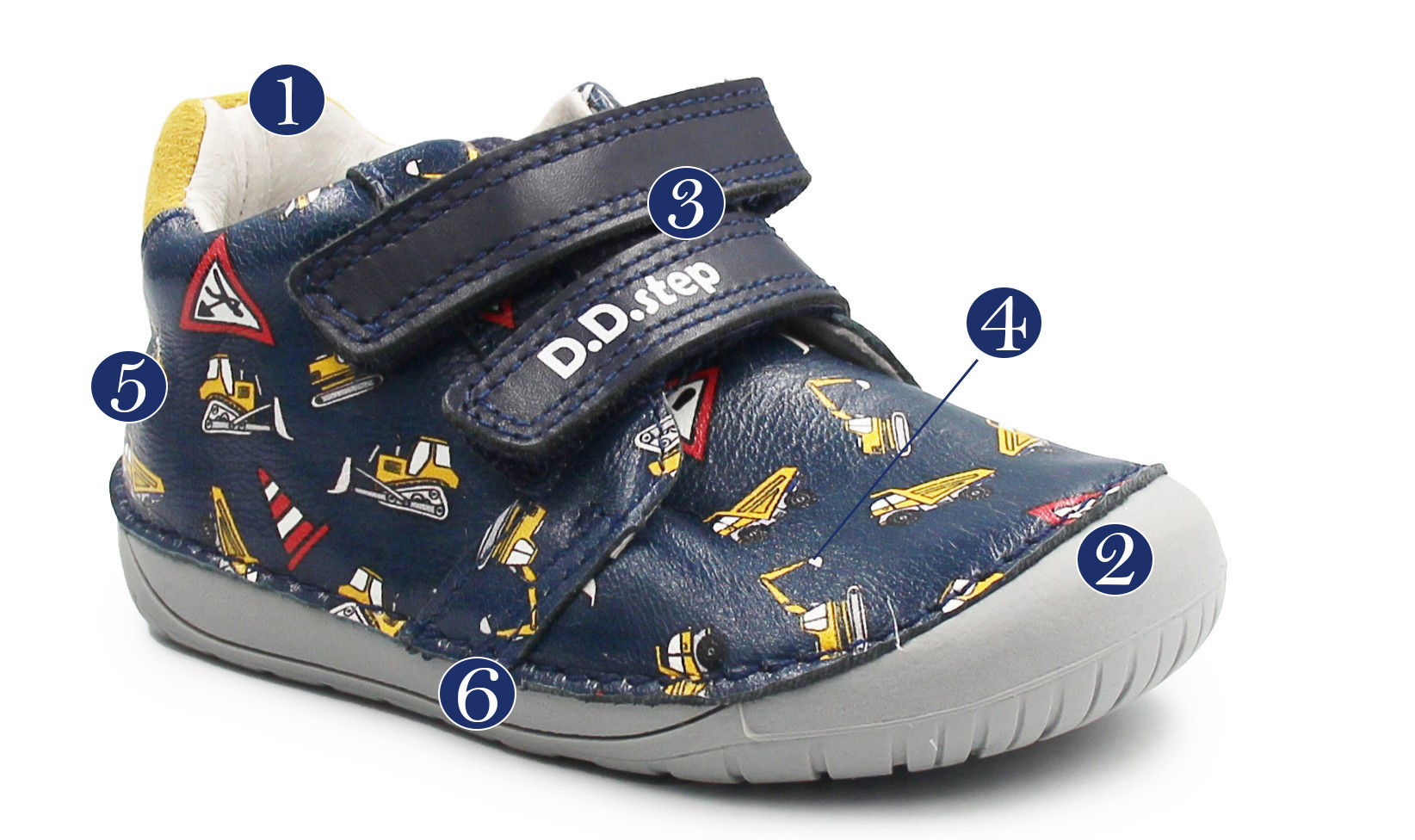 Zarówno z zewnątrz, jak i w środku, wykonane są z miękkiej skóry, co zapewnia komfort i odpowiednią wentylację dla stóp. Ich elastyczna, miękka podeszwa zapewnia swobodę ruchów. Zapiętek delikatnie stabilizuje stopę, jednocześnie pozostawiając dużo miejsca na palce. Zapinane za pomocą dwóch rzepów, co jest praktyczne oraz szybkie, a dodatkowo umożliwia dziecku samodzielne zakładanie. Elastyczna podeszwa dopasowuje się do kształtu stopy, zapewniając maksymalne czucie powierzchni i naturalny ruch. Buty posiadają szersze czubki, co daje więcej miejsca z przodu na paluszki, przez co mogą one zachować naturalne ułożenie.