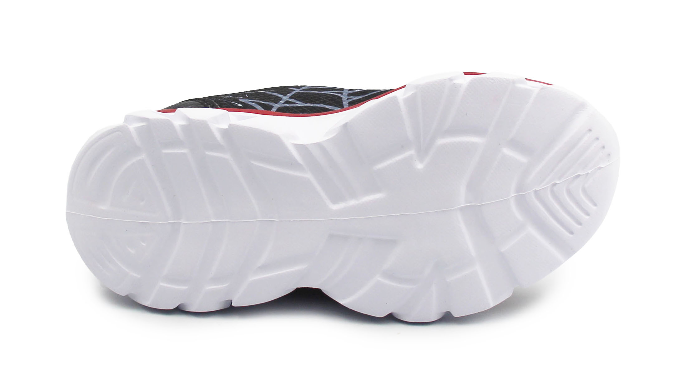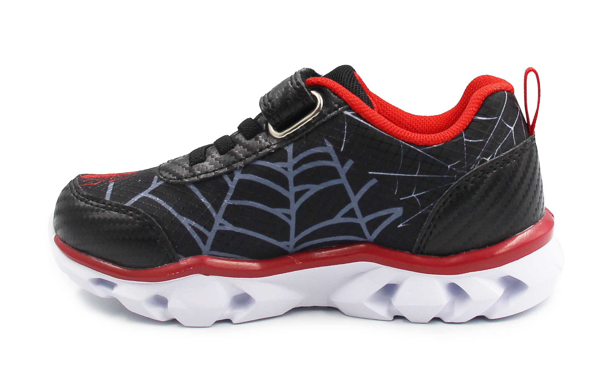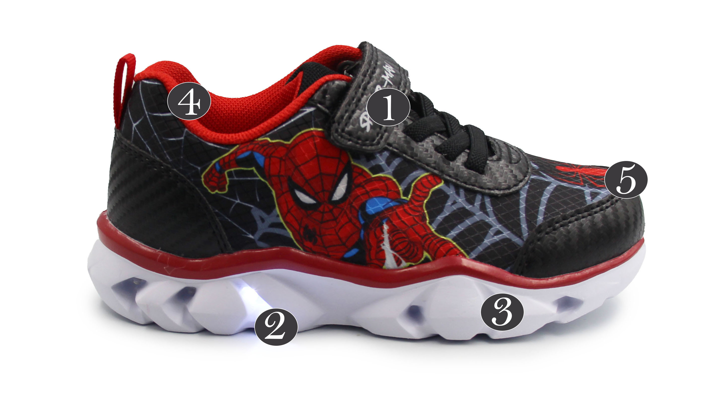 Wykonane z miękkich materiałów. W zewnętrznej stronie buta znajduje się bohater znanej bajki. Spider Man. Buty wyróżniają się aplikacją z motywem oraz wbudowanymi diodami LED, które świecą przy każdym kroku.