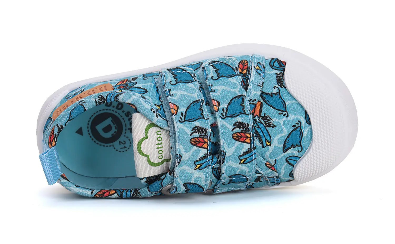 Dziecięce buty tekstylne z motywem rekinów w kolorystyce niebieskiej. To obuwie zarówno na dwór jak i jako obuwie zmienne do szkoły czy przedszkola. Regulowane za pomocą dwóch rzepów, które są szybkie, łatwe oraz praktyczne w użyciu. Wyposażone w powłokę hydrofobową, która odciągać wilgoć. Dla zwiększenia wodoodporności zaleca się przed stosowaniem użycie impregnatu.
