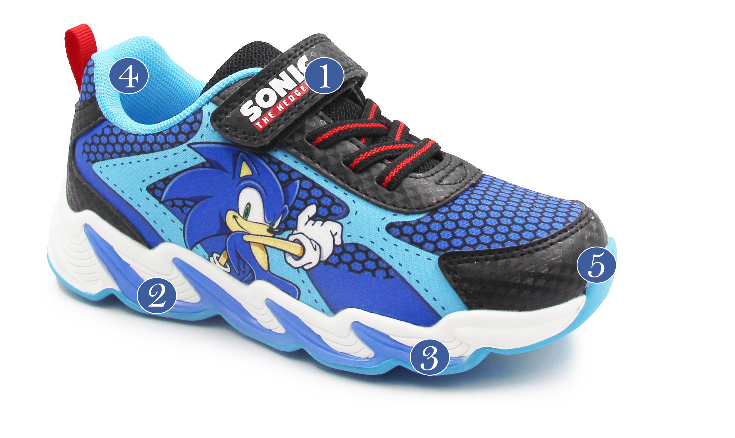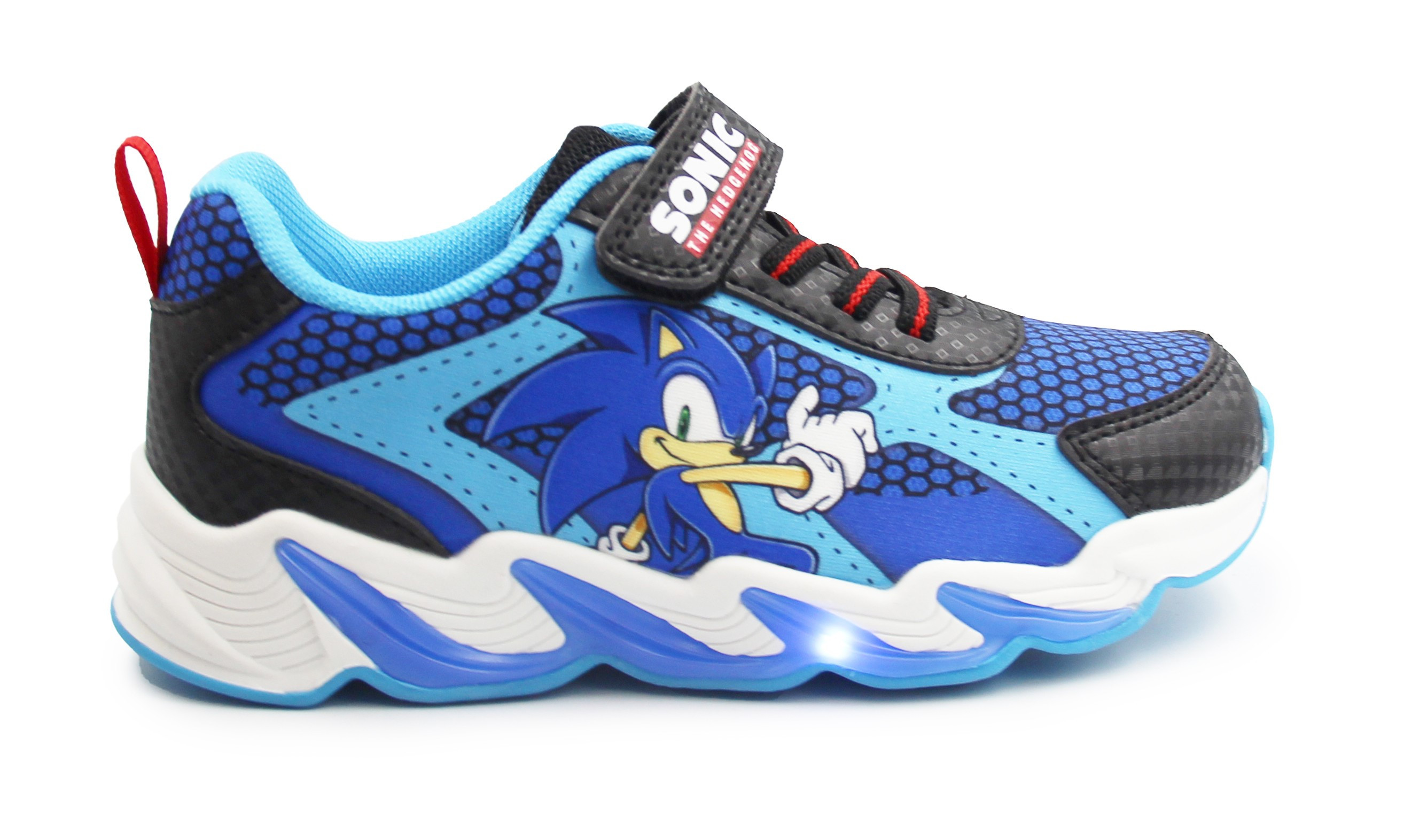 Wykonane z miękkich materiałów. W zewnętrznej stronie buta znajduje się bohater bajki Sonic. Buty wyróżniają się aplikacją oraz wbudowanymi diodami LED, które świecą przy każdym kroku w podeszwie.