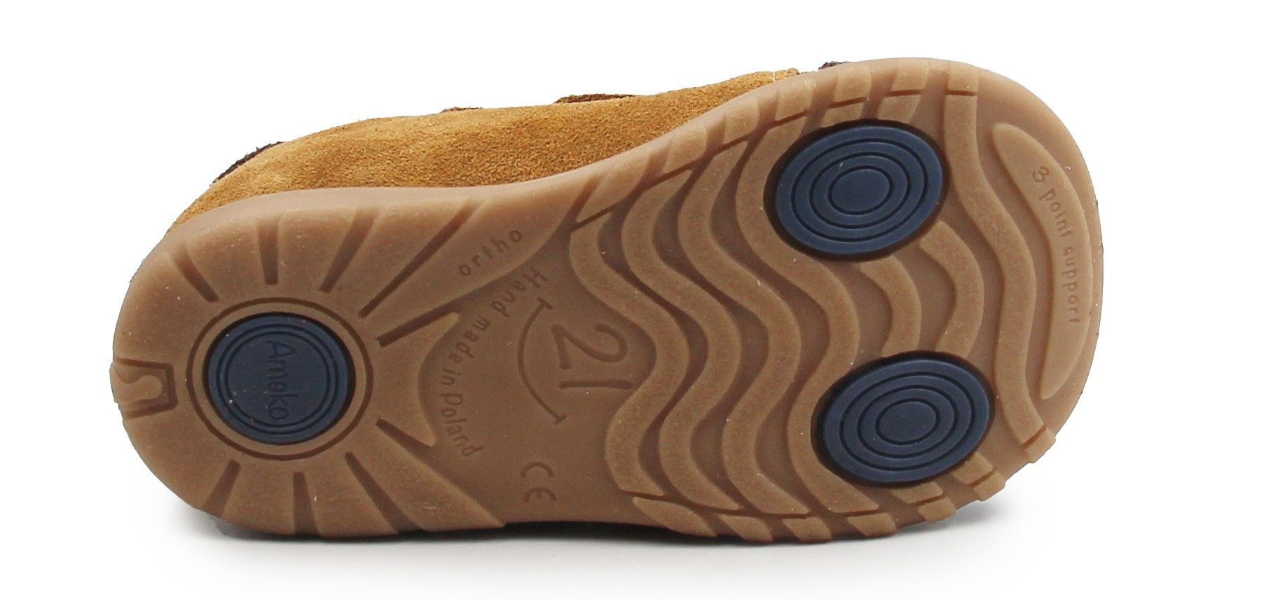 Buciki są przestronne w okolicach palcy, by dziecko miało pełną swobodę ruchu, co jest kluczowe od najmłodszych lat. Wnętrze wyposażóne jest w bezchromową wyściółkę oraz inteligentną wkładkę samoprofilującą. Podeszwa posiada trzy punkty podparcia, a usztywniona pięta stabilizuje postawę.