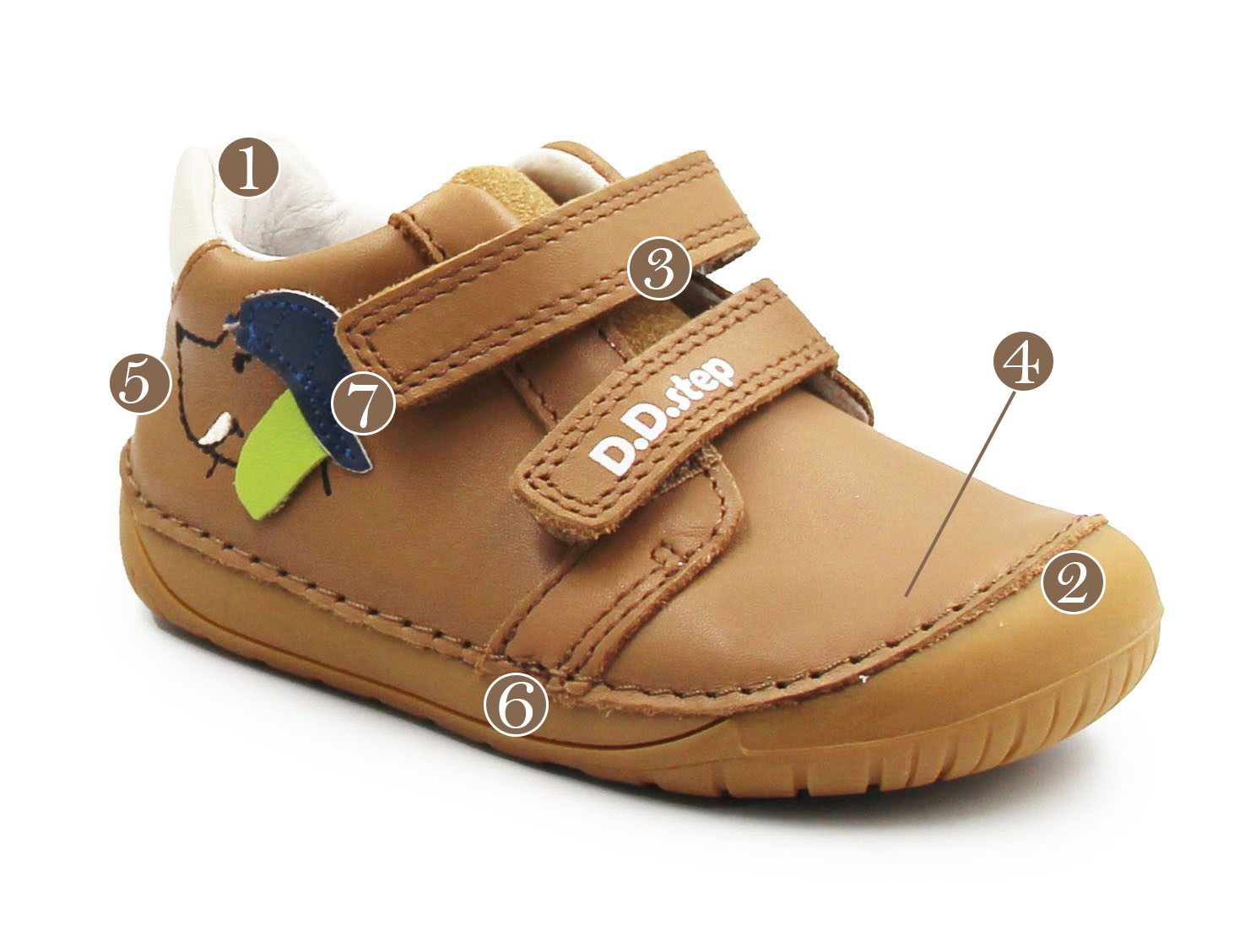 Zarówno z zewnątrz, jak i w środku, wykonane są z miękkiej skóry, co zapewnia komfort i odpowiednią wentylację dla stóp. Ich elastyczna, miękka podeszwa zapewnia swobodę ruchów. Zapinane za pomocą dwóch rzepów, co jest praktyczne oraz szybkie, a dodatkowo umożliwia dziecku samodzielne zakładanie. Buty posiadają szersze czubki, co daje więcej miejsca z przodu na paluszki, przez co mogą one zachować naturalne ułożenie.