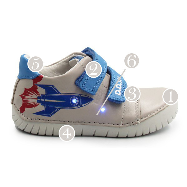 Buty wyróżniają się aplikacją z motywem samochodu oraz wbudowanymi diodami LED, które świecą przy każdym kroku. Można je łatwo włączać i wyłączać specjalnym przyciskiem umieszczonym na rzepie. Elastyczna i wytrzymała podeszwa z naturalnego kauczuku zapewnia dobrą przyczepność i amortyzację, jednocześnie nie obciążając stopy.