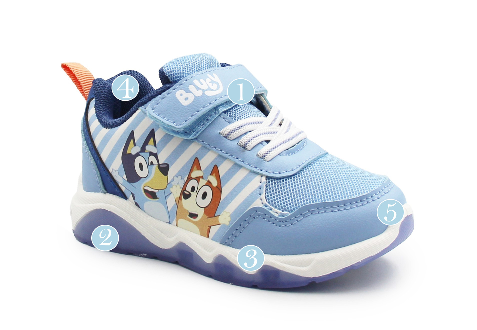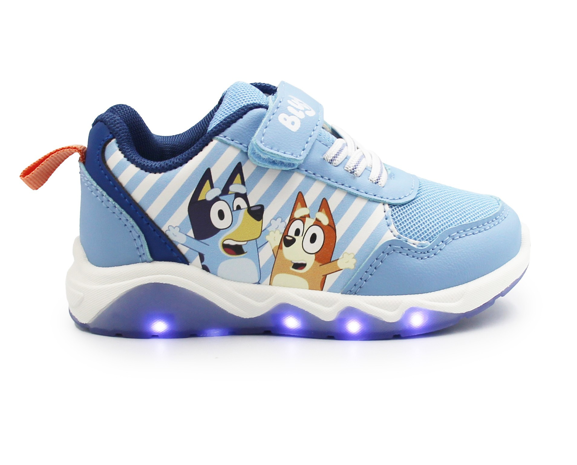 Wykonane z miękkich materiałów. W zewnętrznej stronie buta znajdują się bohaterowie znanej bajki Bluey. Buty wyróżniają się aplikacją oraz wbudowanymi diodami LED, które świecą przy każdym kroku w podeszwie.