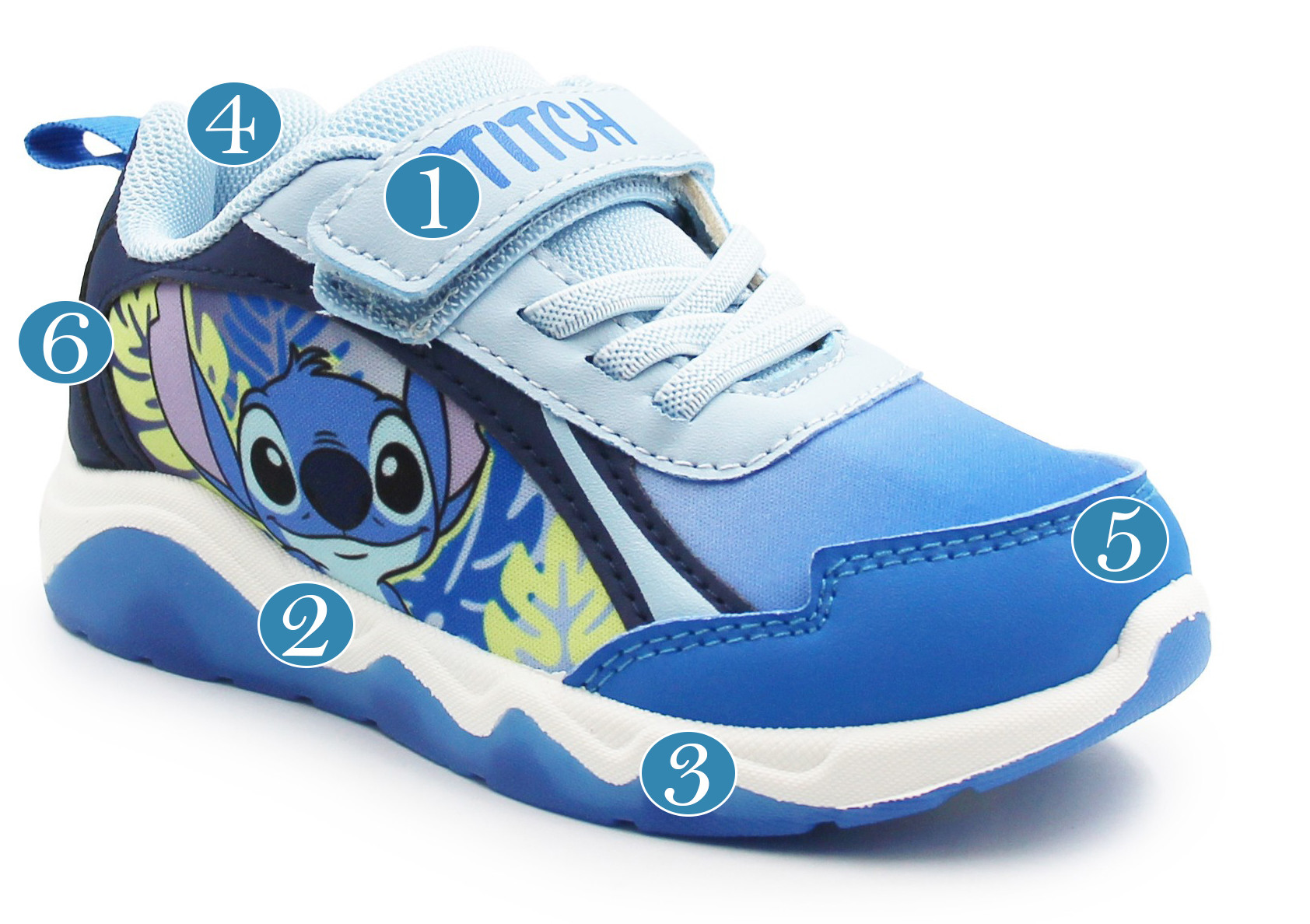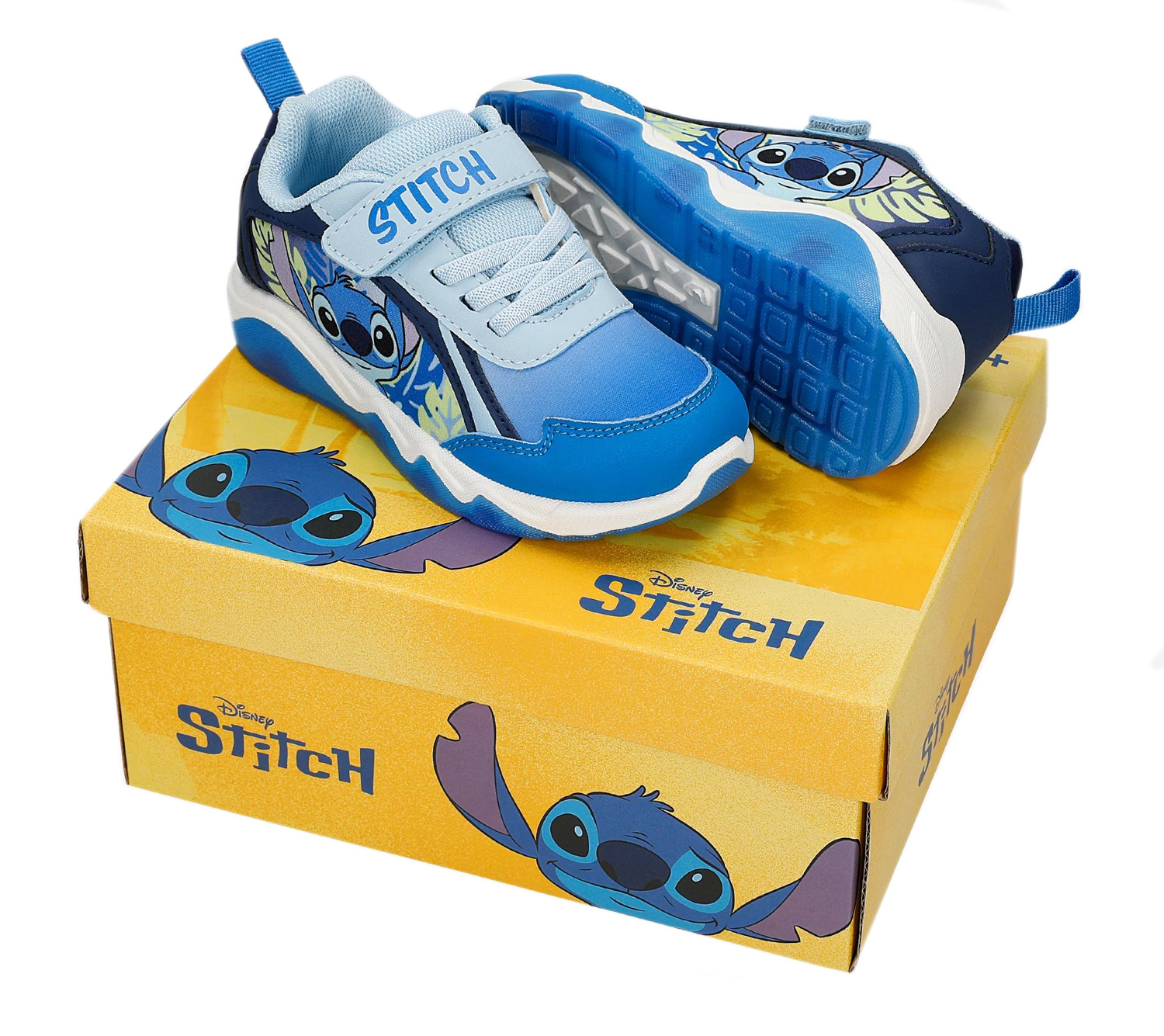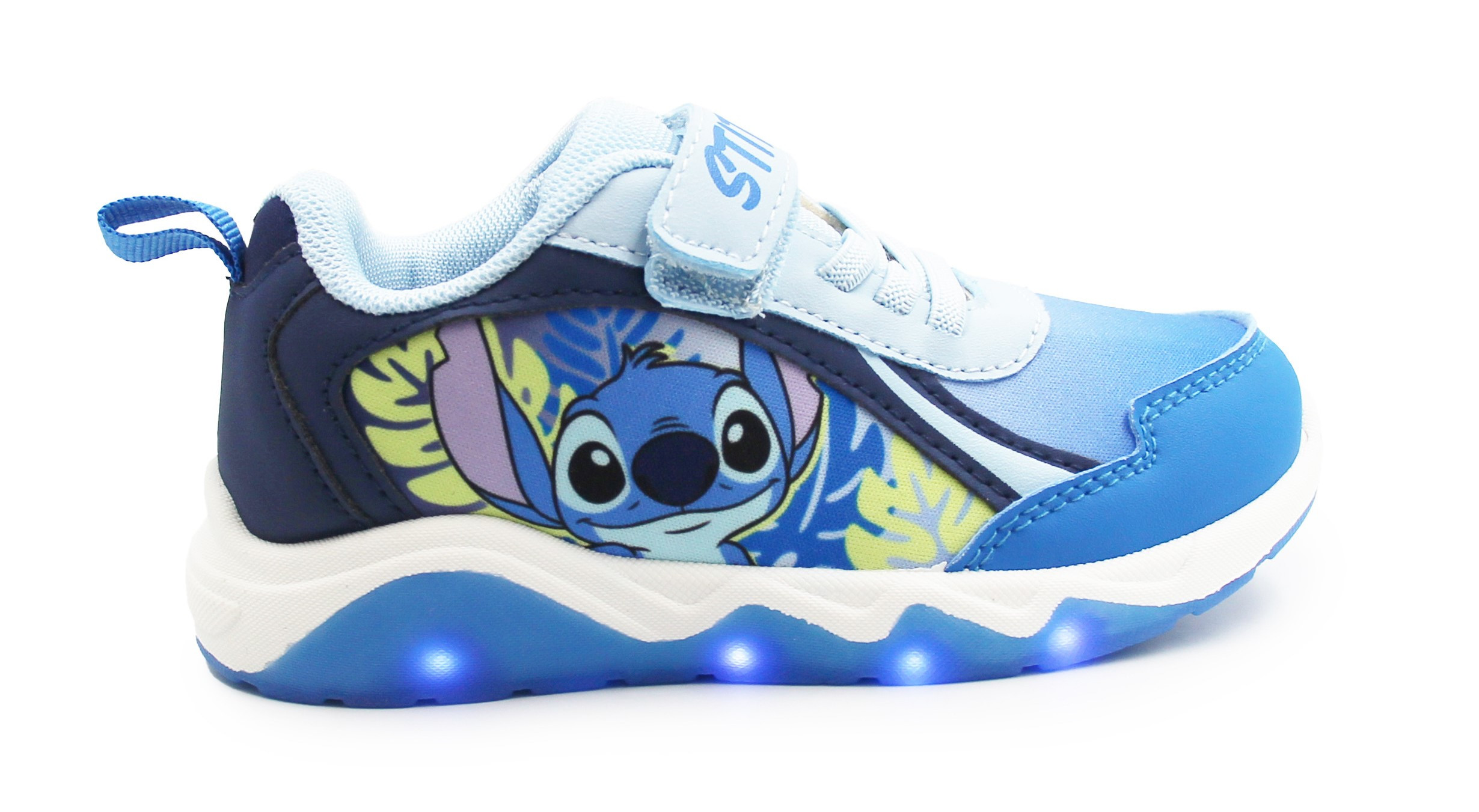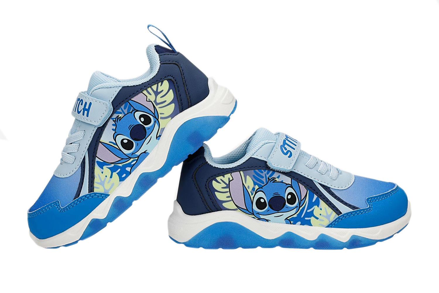 Wykonane z miękkich materiałów. W zewnętrznej stronie buta znajdują się bohaterowie znanej bajki Lilo i Stitch. Buty wyróżniają się aplikacją oraz wbudowanymi diodami LED, które świecą przy każdym kroku w podeszwie.