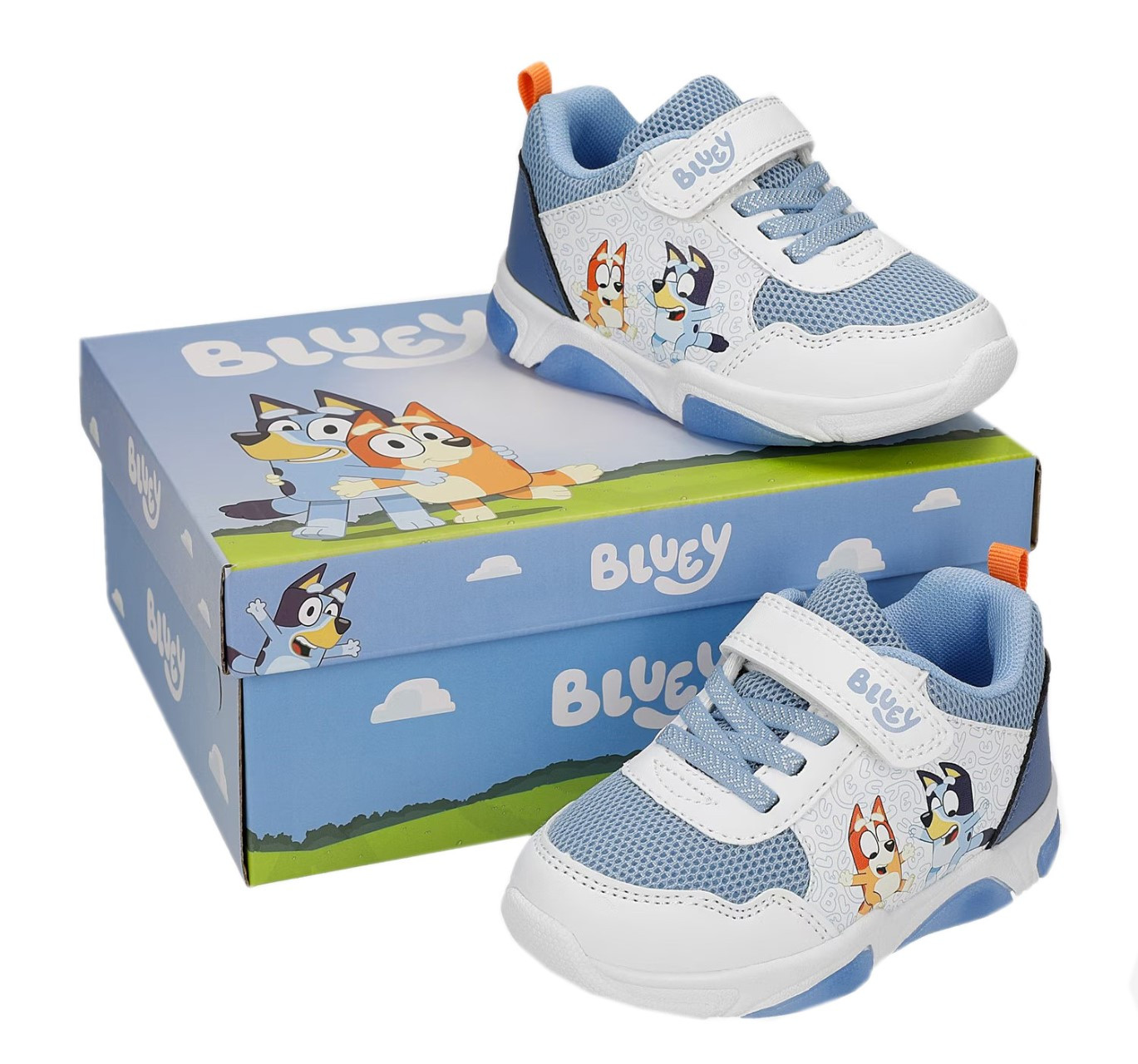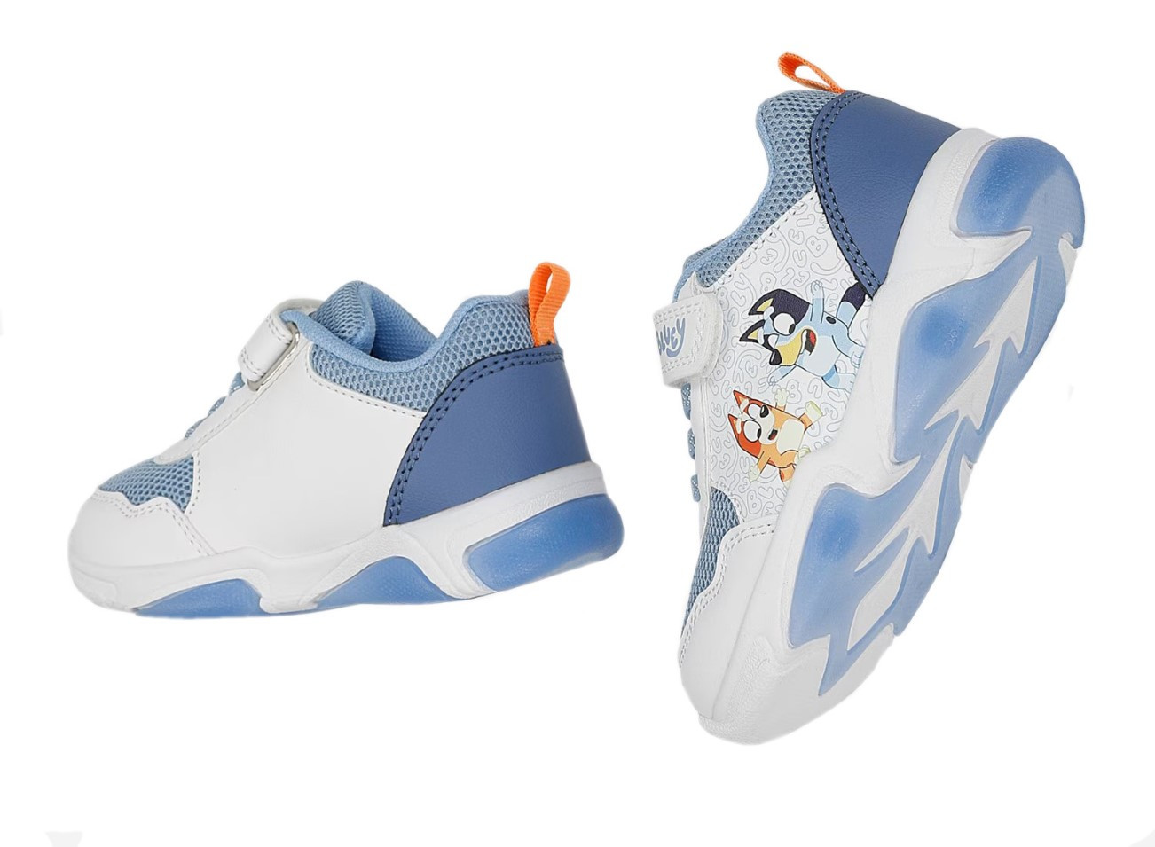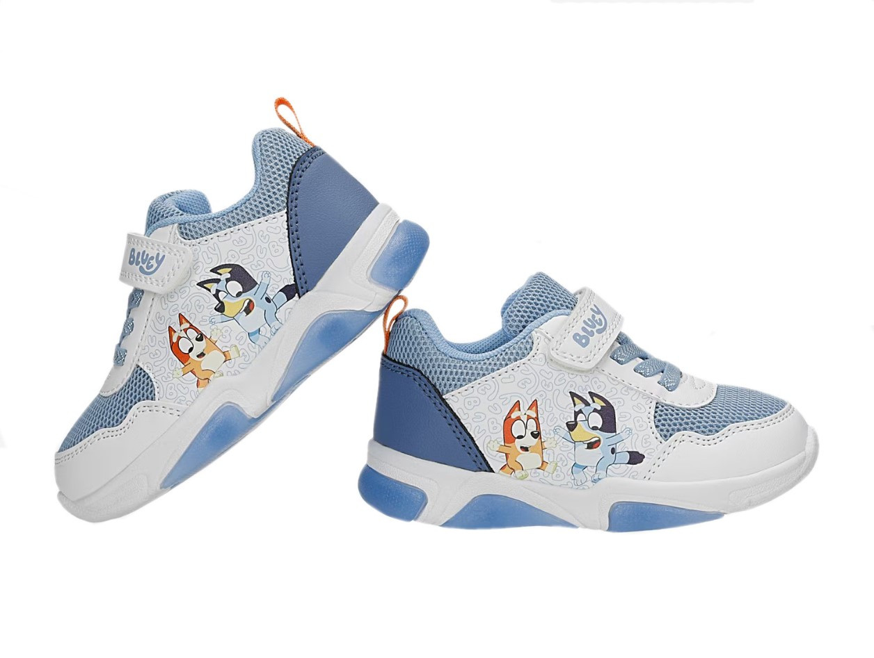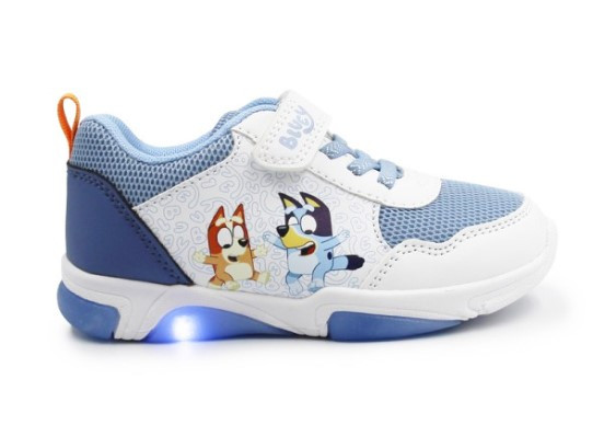 Wykonane z miękkich materiałów. W zewnętrznej stronie buta znajdują się bohaterowie znanej bajki Bluey. Buty wyróżniają się aplikacją oraz wbudowanymi diodami LED, które świecą przy każdym kroku w podeszwie.