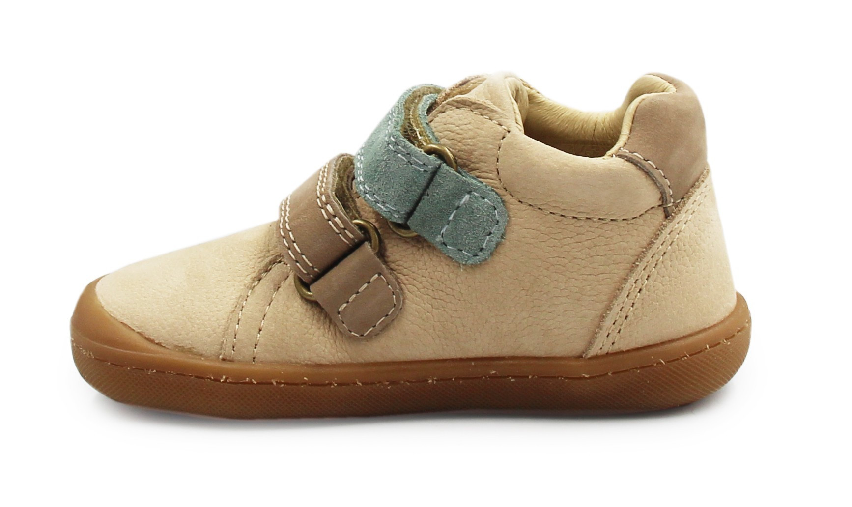 Skórzane buty dziecięce z elastyczną podeszwą, która zapewnia stopie naturalny ruch podczas poruszania. Zapinane za pomocą dwóch praktycznych rzepów. Skórzane wnętrze wypełnione przy kołnierzu miękką pianką.