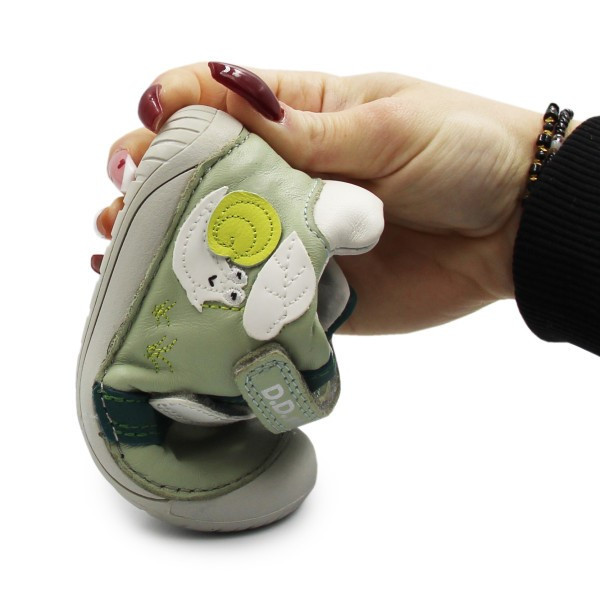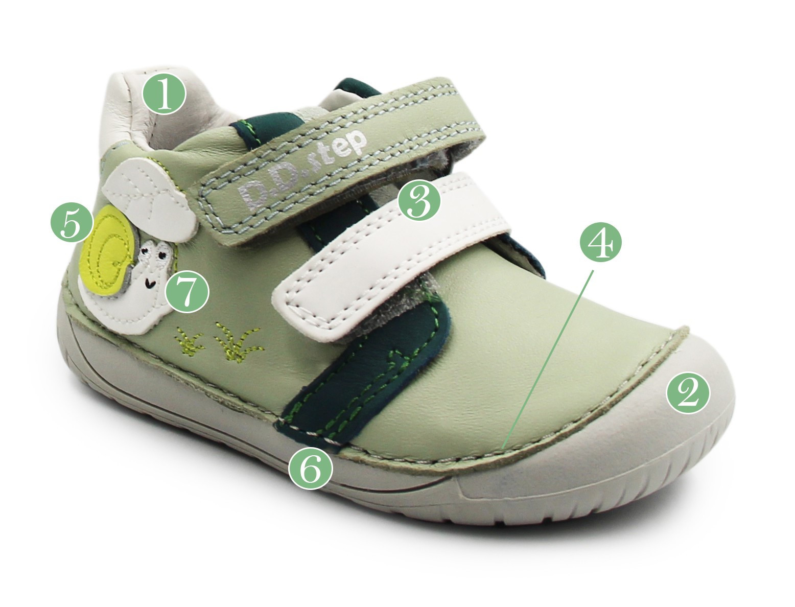 Zarówno z zewnątrz, jak i w środku, wykonane są z miękkiej skóry, co zapewnia komfort i odpowiednią wentylację dla stóp. Ich elastyczna, miękka podeszwa zapewnia swobodę ruchów. Zapinane za pomocą dwóch rzepów, co jest praktyczne oraz szybkie, a dodatkowo umożliwia dziecku samodzielne zakładanie. Buty posiadają szersze czubki, co daje więcej miejsca z przodu na paluszki, przez co mogą one zachować naturalne ułożenie.