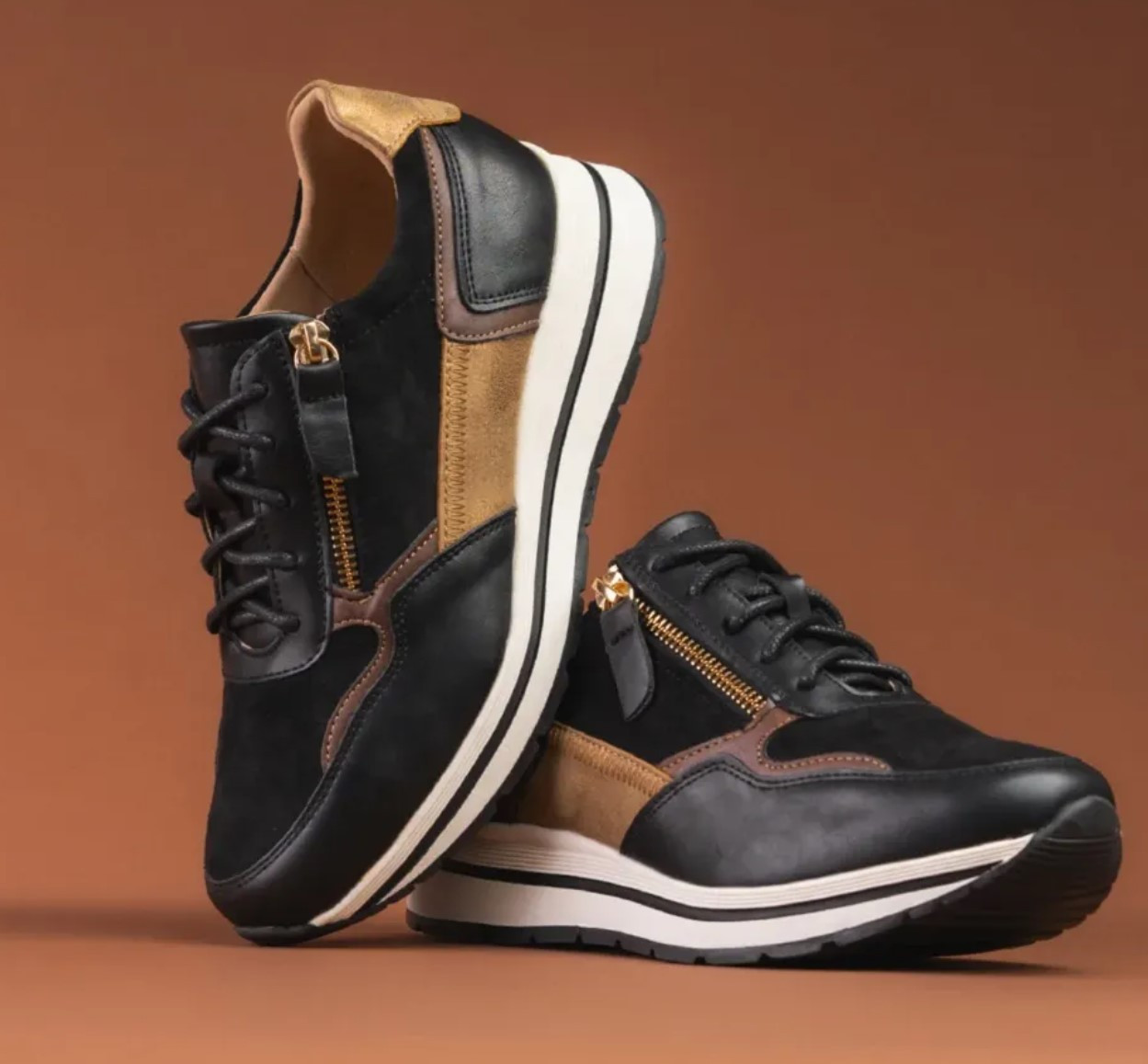 3. Uniwersalny design - kolorystyka łącząca czerń, brąz i złoty, tworzy elegancki, a jednocześnie casualowy charakter butów. Buty doskonale komponują się zarówno ze spodniami jeansowymi, jak i sukienkami czy spódnicami
