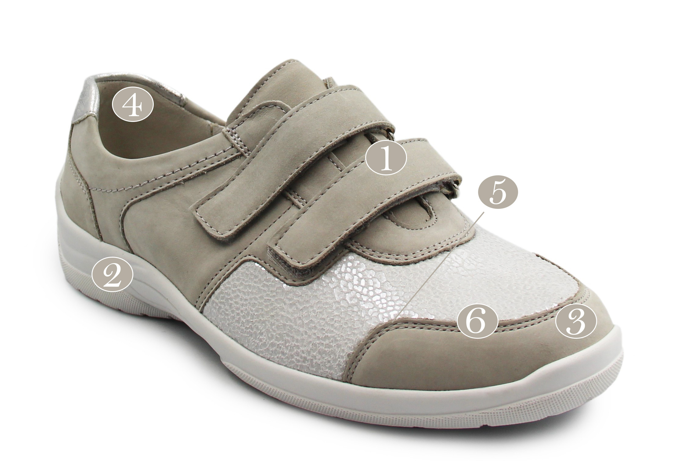 1. Zapięcie za pomocą dwóch rzepów, które są wygodne, szybkie, co za tym idzie - praktyczne w użytkowaniu. Dają możliwość dopasowania obuwia do tęgości stóp.
