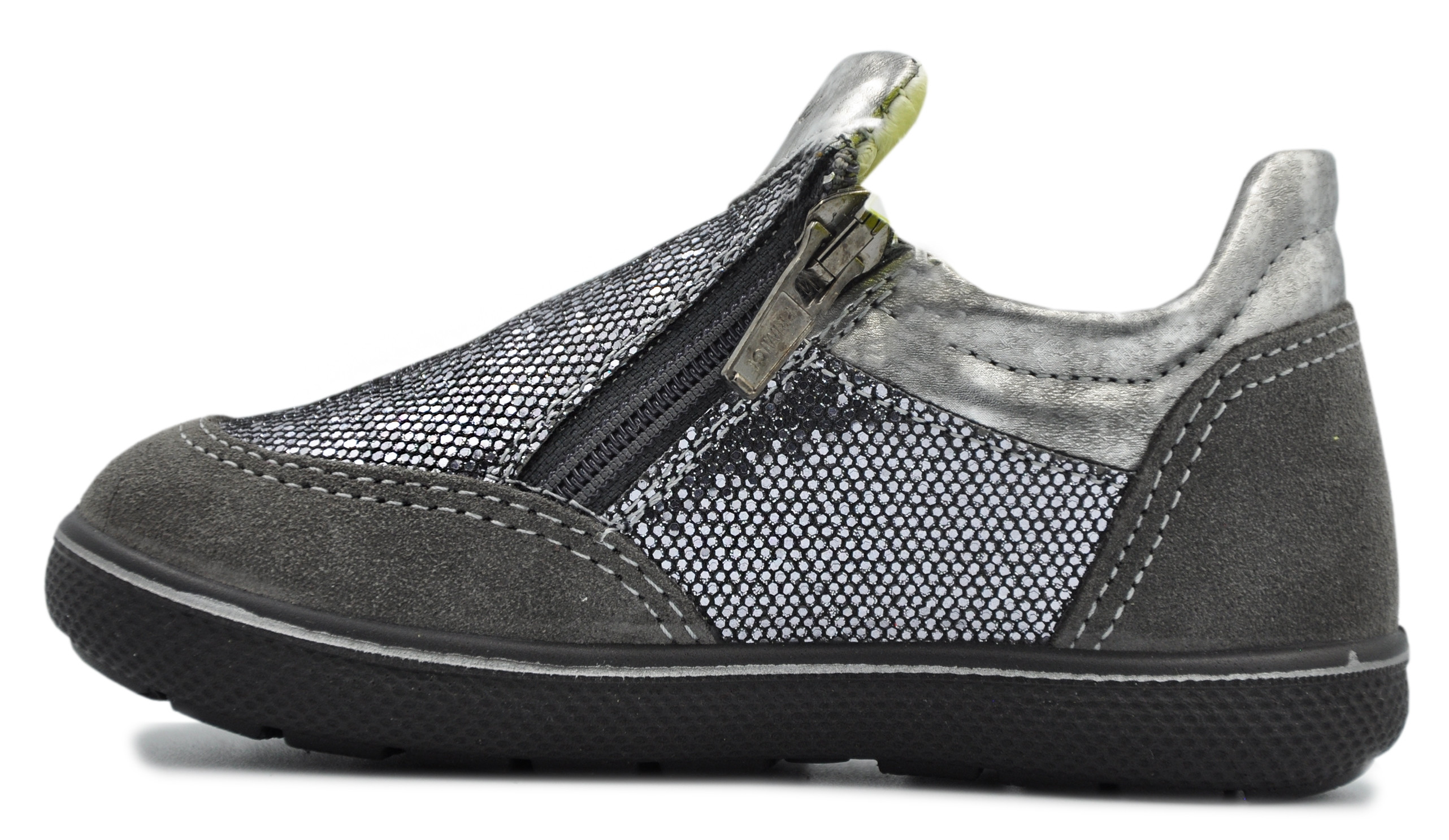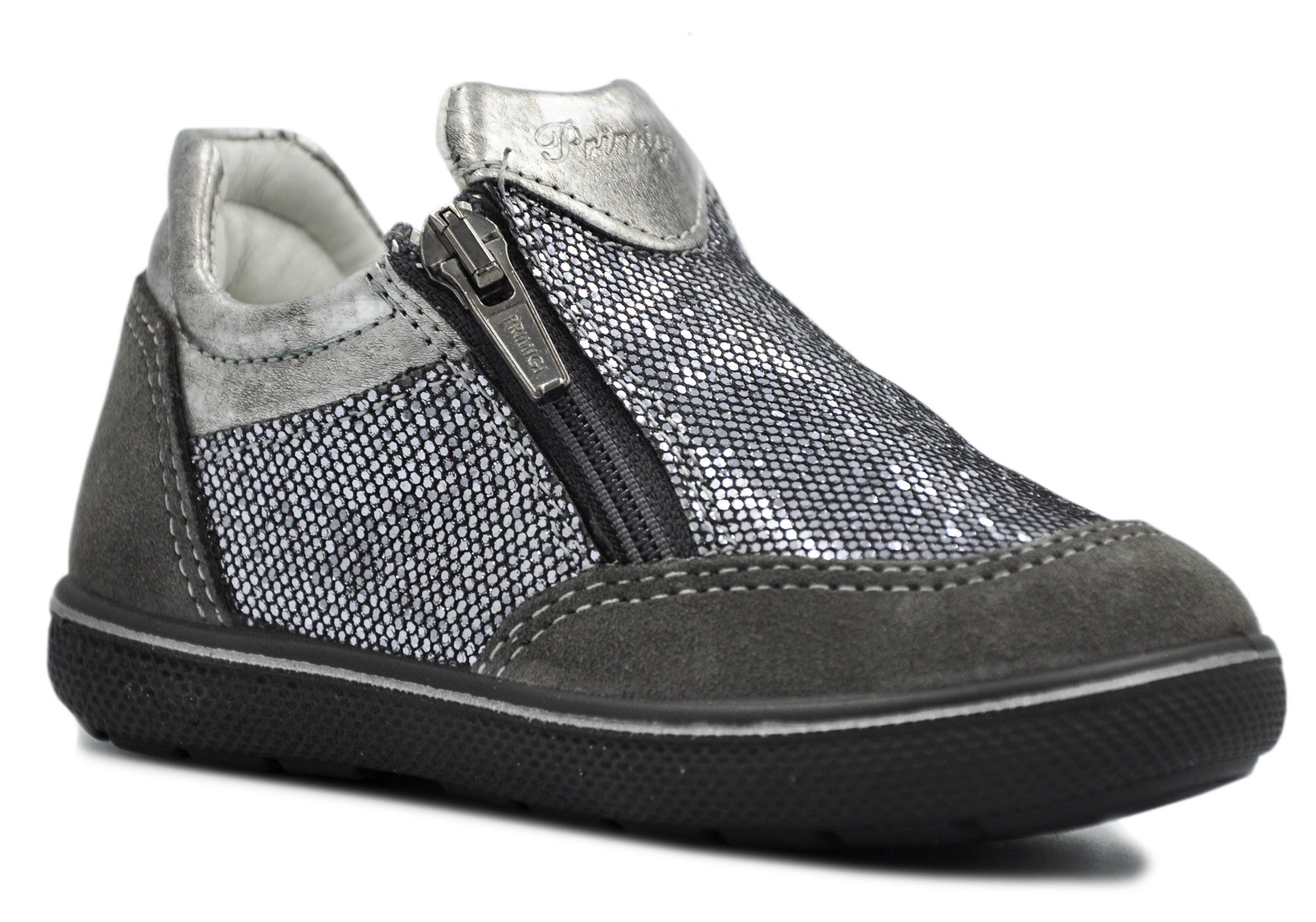 Wykonane z niezwykłą dbałością o detale. Szaro srebrny trzewik zapinany na dwa suwaki, dzięki czemu dziecko bez problemu założy je samo.