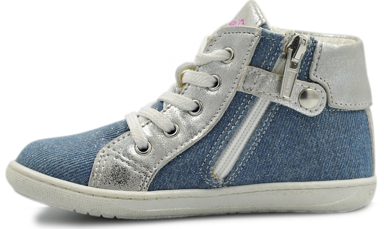 Jeansowe materiałowe trzewiki połączone ze srebrną skórą naturalną i uroczymi serduszkami.