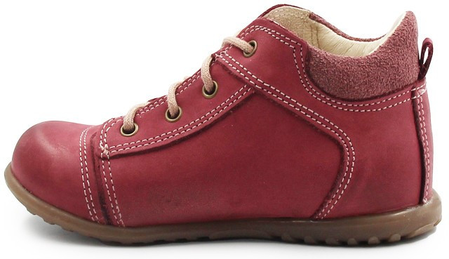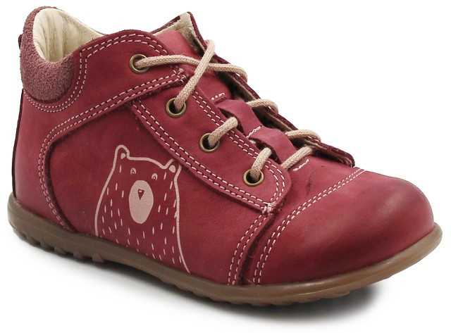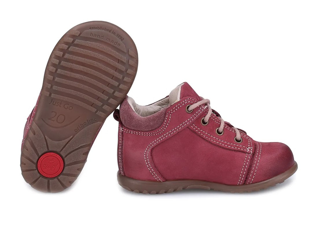Jesienne buciki dziecięce w odcieniach różu oraz czerwieni. Zapinane za pomocą sznurowadeł bawełnianych, które pozwalają na indywidualne dopasowanie do stopy dziecka.