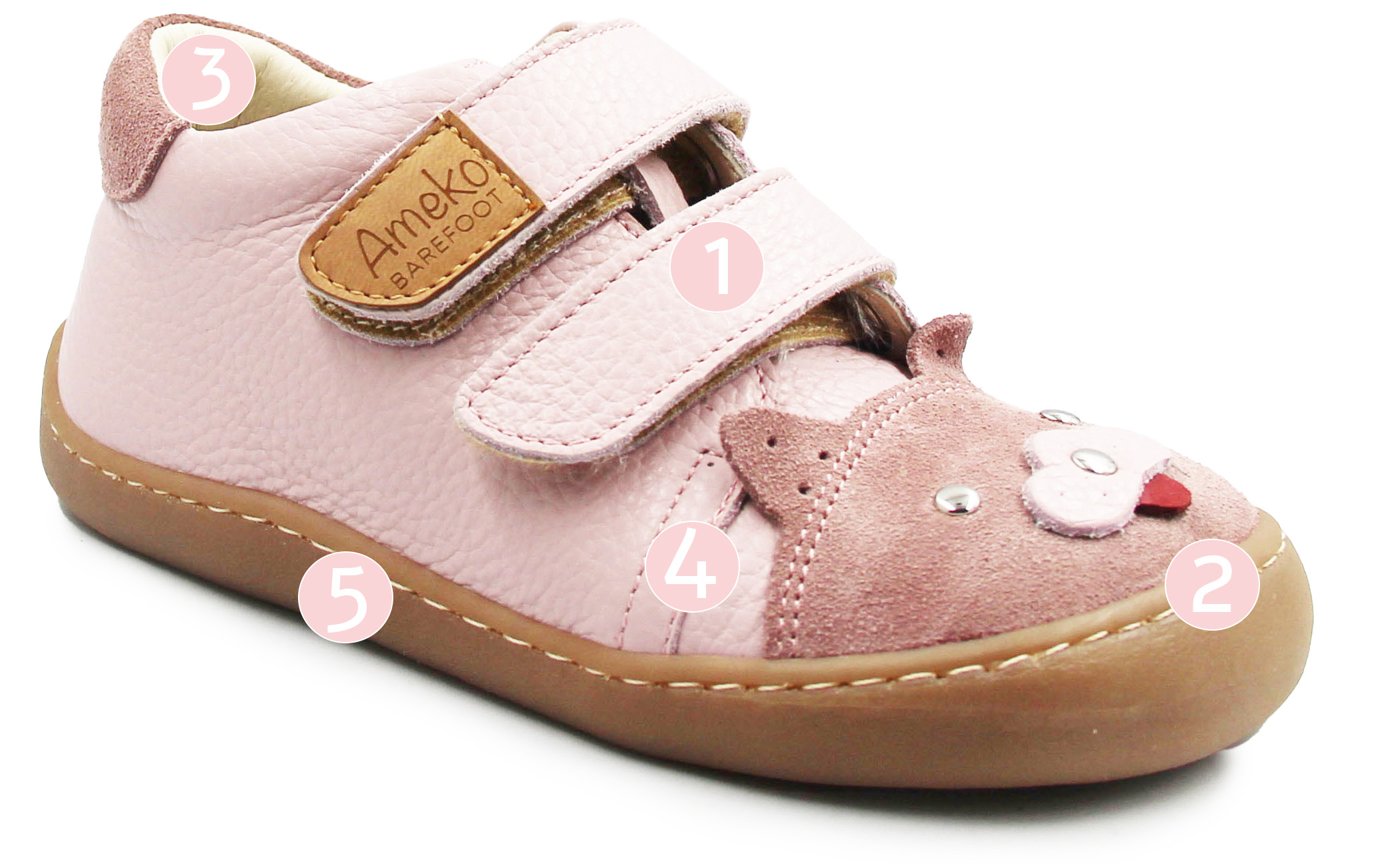 Półbuty dziewczęce wykonane ze skóry z elastyczną podeszwą Barefoot, która daje uczucie "chodzenia na boso". Zapięcie za pomocą rzepów umożliwia dopasowanie butów do stopy dziecka. Skórzana wkładka, zapewnia odpowiednią wentylację.