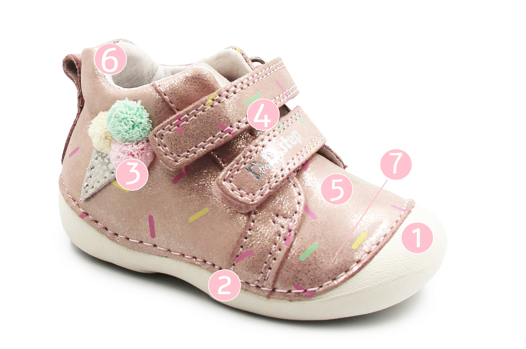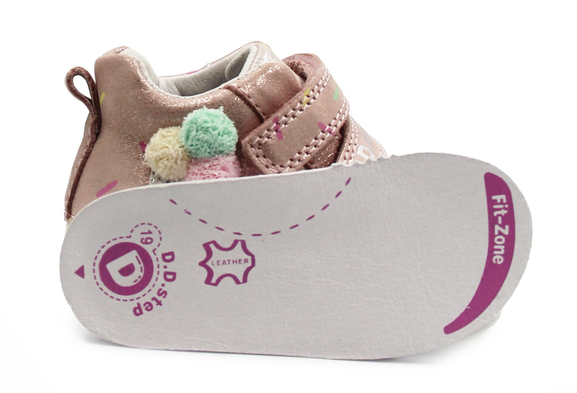 Zarówno z zewnątrz, jak i w środku, wykonane są z miękkiej skóry, co zapewnia komfort i odpowiednią wentylację dla stóp. Ich elastyczna, miękka podeszwa zapewnia swobodę ruchów. Usztywniony zapiętek delikatnie stabilizuje stopę, jednocześnie pozostawiając dużo miejsca na palce. Zapinane za pomocą dwóch rzepów, co jest praktyczne oraz szybkie, a dodatkowo umożliwia dziecku samodzielne zakładanie.