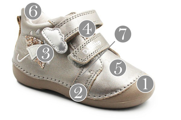 Zarówno z zewnątrz, jak i w środku, wykonane są z miękkiej skóry, co zapewnia komfort i odpowiednią wentylację dla stóp. Ich elastyczna, miękka podeszwa zapewnia swobodę ruchów. Usztywniony zapiętek delikatnie stabilizuje stopę, jednocześnie pozostawiając dużo miejsca na palce. Zapinane za pomocą dwóch rzepów, co jest praktyczne oraz szybkie, a dodatkowo umożliwia dziecku samodzielne zakładanie.