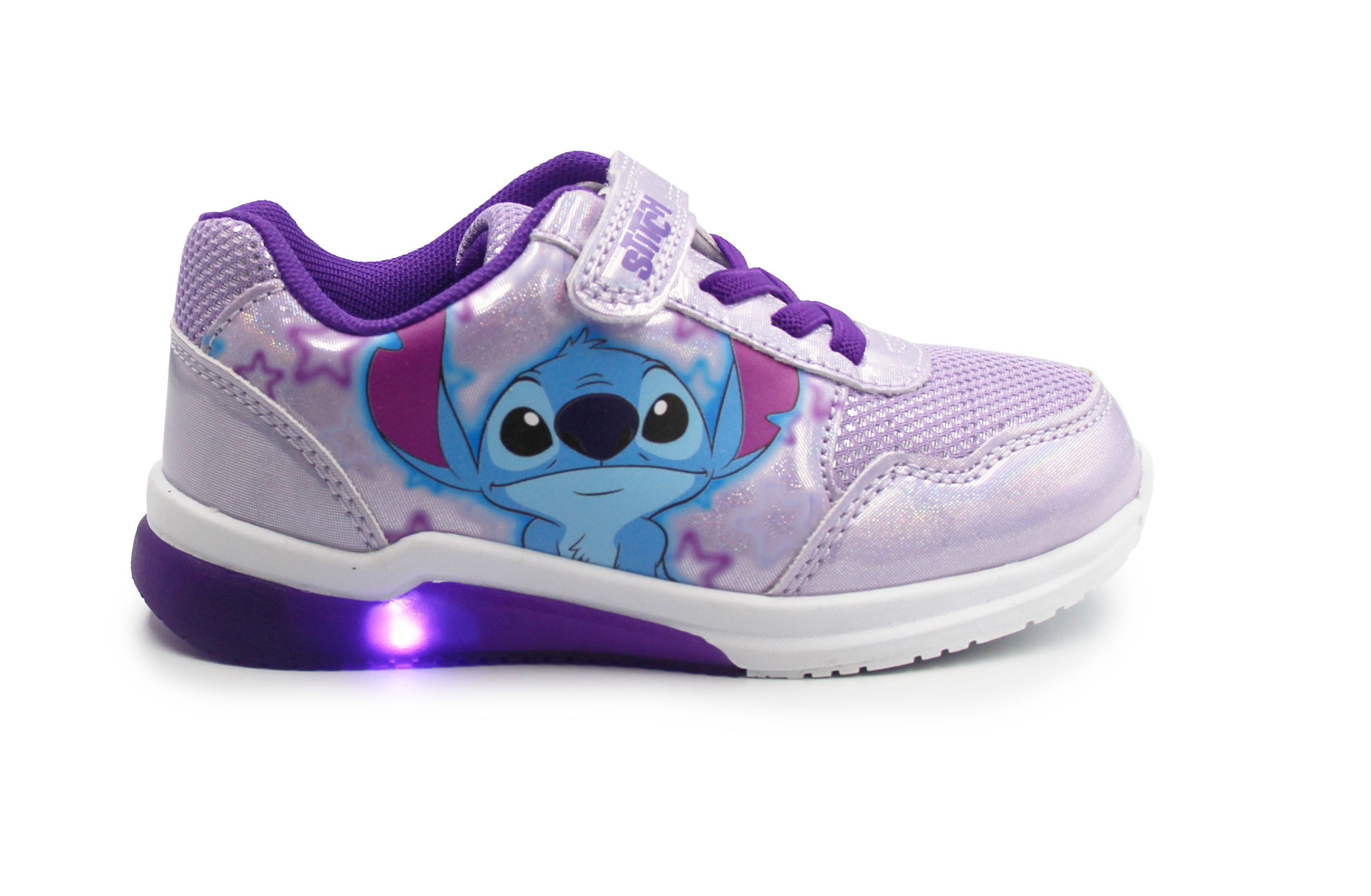 Wykonane z miękkich materiałów. W zewnętrznej stronie buta znajduje się bohater znanej bajki Lilo i Stitch. Buty wyróżniają się aplikacją oraz wbudowanymi diodami LED, które świecą przy każdym kroku w podeszwie.