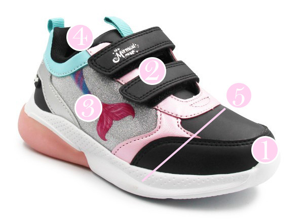 Z boku obuwia po wewnętrznej stronie znajduje się przycisk, który włącza oraz wyłącza świecące elementy. Światełka zapalają się po uderzeniu o podłoże.
