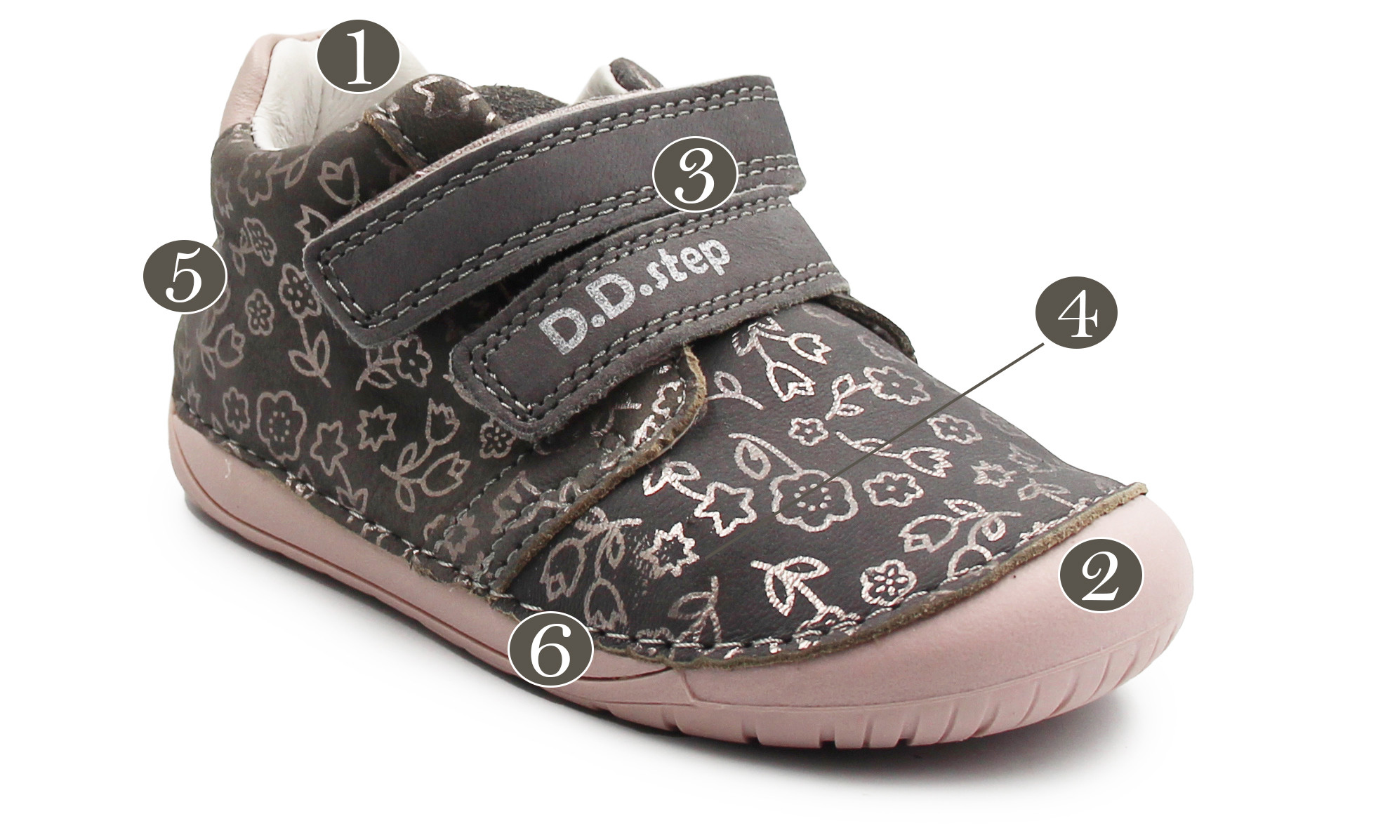 Zarówno z zewnątrz, jak i w środku, wykonane są z miękkiej skóry, co zapewnia komfort i odpowiednią wentylację dla stóp. Ich elastyczna, miękka podeszwa zapewnia swobodę ruchów. Usztywniony zapiętek delikatnie stabilizuje stopę, jednocześnie pozostawiając dużo miejsca na palce. Zapinane za pomocą dwóch rzepów, co jest praktyczne oraz szybkie, a dodatkowo umożliwia dziecku samodzielne zakładanie. Podeszwa dopasowuje się do kształtu stopy, co zapewnia doskonałe czucie podłoża.